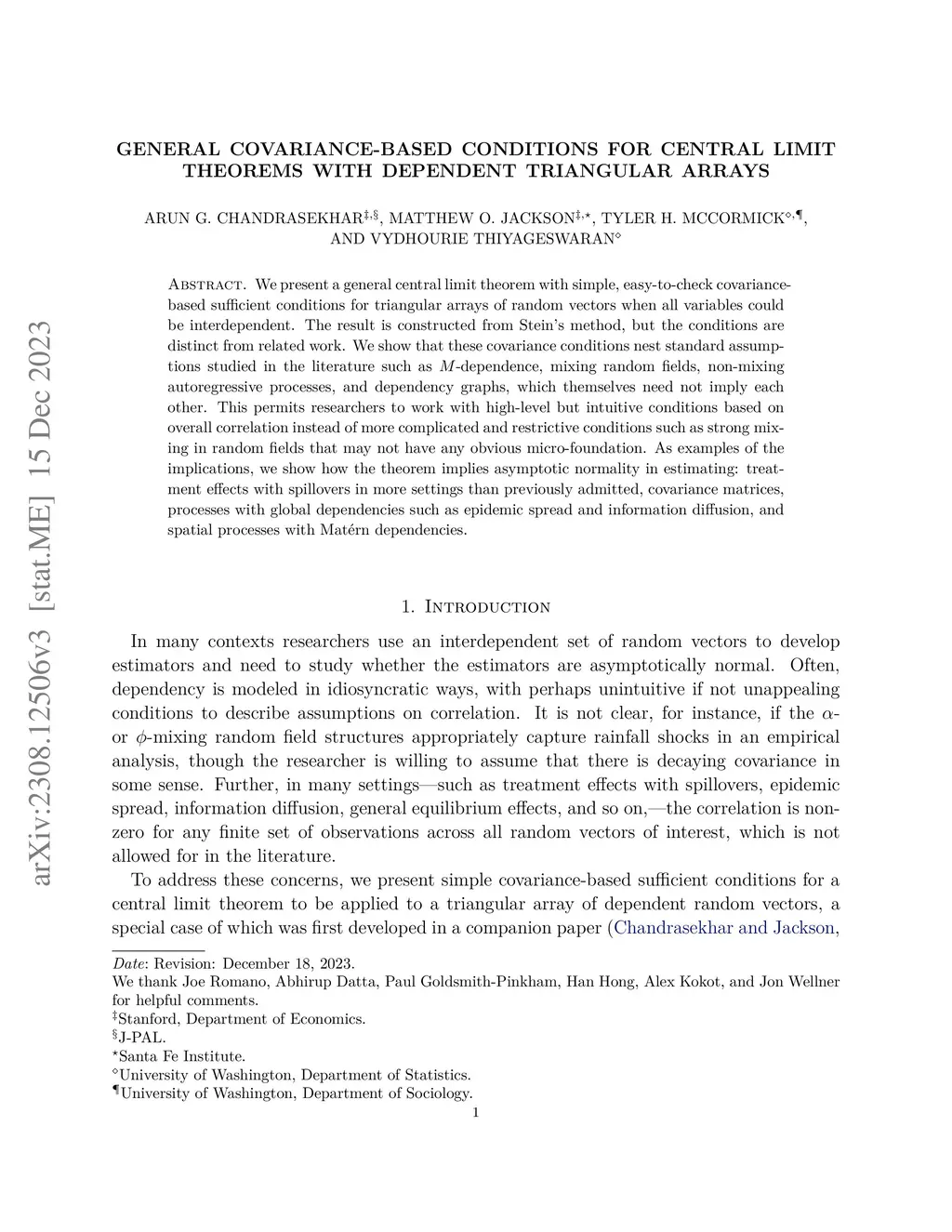 We present a general central limit theorem with simple, easy-to-check covariance-based sufficient conditions for triangular arrays of random vectors when all variables could be interdependent. The result is constructed from Stein's method, but the conditions are distinct from related work. We show that these covariance conditions nest standard assumptions studied in the literature such as -dependence, mixing random fields, non-mixing autoregressive processes, and dependency graphs, which themselves need not imply each other. This permits researchers to work with high-level but intuitive conditions based on overall correlation instead of more complicated and restrictive conditions such as strong mixing in random fields that may not have any obvious micro-foundation. As examples of the implications, we show how the theorem implies asymptotic normality in estimating: treatment effects with spillovers in more settings than previously admitted, covariance matrices, processes with global dependencies such as epidemic spread and information diffusion, and spatial process with Mat\'{e}rn dependencies.