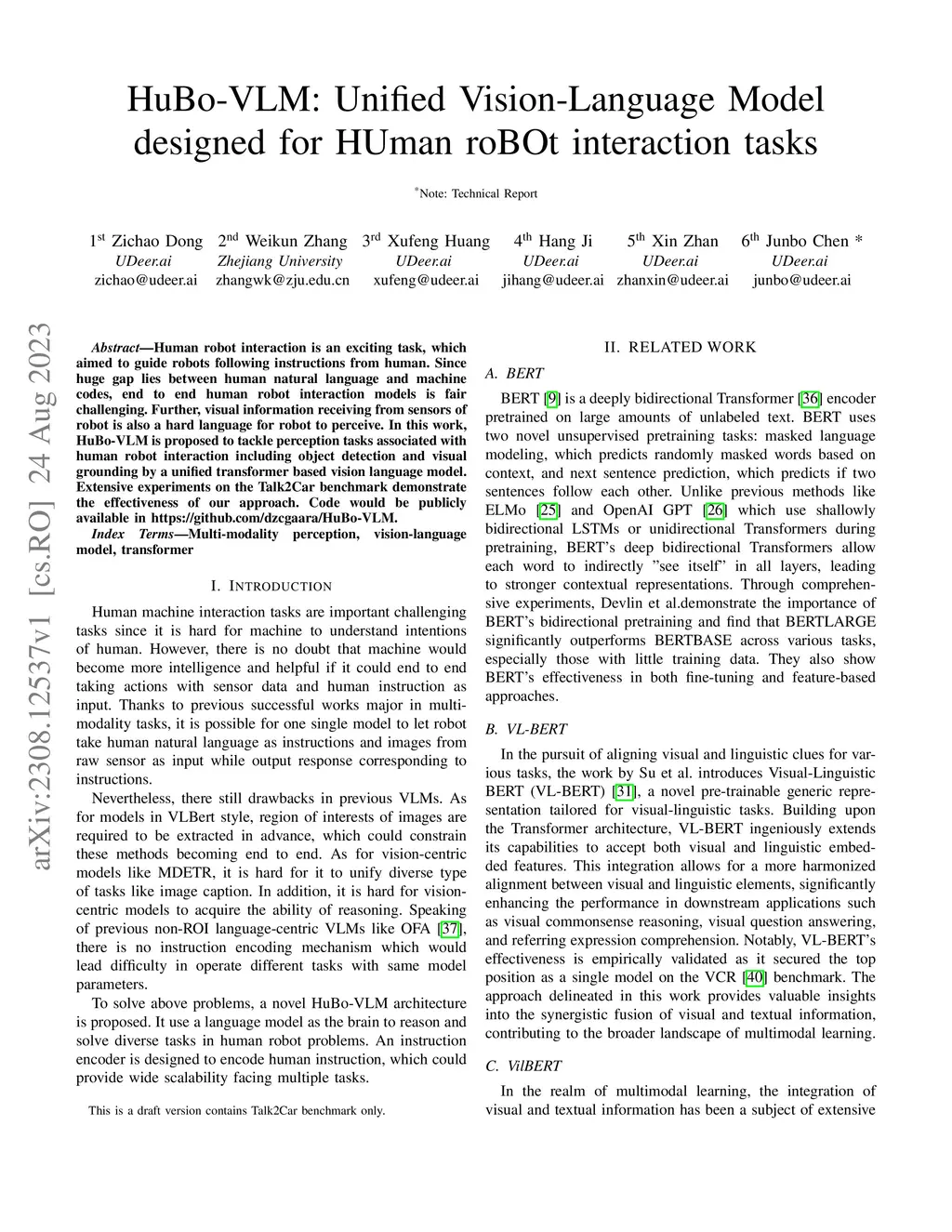 Human robot interaction is an exciting task, which aimed to guide robots following instructions from human. Since huge gap lies between human natural language and machine codes, end to end human robot interaction models is fair challenging. Further, visual information receiving from sensors of robot is also a hard language for robot to perceive. In this work, HuBo-VLM is proposed to tackle perception tasks associated with human robot interaction including object detection and visual grounding by a unified transformer based vision language model. Extensive experiments on the Talk2Car benchmark demonstrate the effectiveness of our approach. Code would be publicly available in https://github.com/dzcgaara/HuBo-VLM.