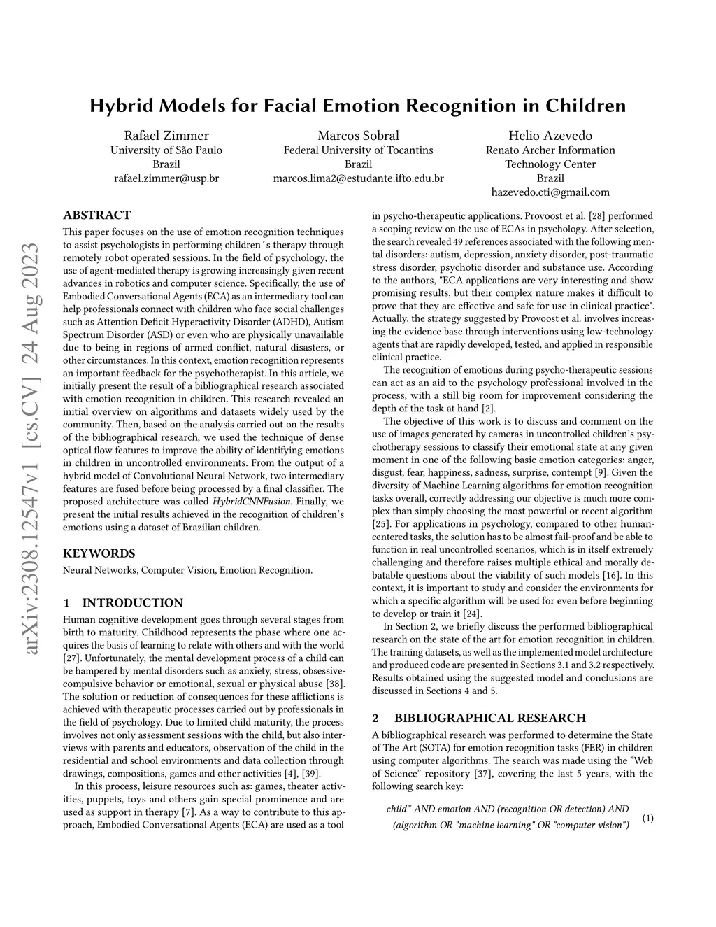 This paper focuses on the use of emotion recognition techniques to assist psychologists in performing children's therapy through remotely robot operated sessions. In the field of psychology, the use of agent-mediated therapy is growing increasingly given recent advances in robotics and computer science. Specifically, the use of Embodied Conversational Agents (ECA) as an intermediary tool can help professionals connect with children who face social challenges such as Attention Deficit Hyperactivity Disorder (ADHD), Autism Spectrum Disorder (ASD) or even who are physically unavailable due to being in regions of armed conflict, natural disasters, or other circumstances. In this context, emotion recognition represents an important feedback for the psychotherapist. In this article, we initially present the result of a bibliographical research associated with emotion recognition in children. This research revealed an initial overview on algorithms and datasets widely used by the community. Then, based on the analysis carried out on the results of the bibliographical research, we used the technique of dense optical flow features to improve the ability of identifying emotions in children in uncontrolled environments. From the output of a hybrid model of Convolutional Neural Network, two intermediary features are fused before being processed by a final classifier. The proposed architecture was called HybridCNNFusion. Finally, we present the initial results achieved in the recognition of children's emotions using a dataset of Brazilian children.