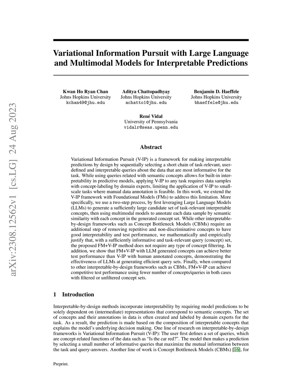 Variational Information Pursuit (V-IP) is a framework for making interpretable predictions by design by sequentially selecting a short chain of task-relevant, user-defined and interpretable queries about the data that are most informative for the task. While this allows for built-in interpretability in predictive models, applying V-IP to any task requires data samples with dense concept-labeling by domain experts, limiting the application of V-IP to small-scale tasks where manual data annotation is feasible. In this work, we extend the V-IP framework with Foundational Models (FMs) to address this limitation. More specifically, we use a two-step process, by first leveraging Large Language Models (LLMs) to generate a sufficiently large candidate set of task-relevant interpretable concepts, then using Large Multimodal Models to annotate each data sample by semantic similarity with each concept in the generated concept set. While other interpretable-by-design frameworks such as Concept Bottleneck Models (CBMs) require an additional step of removing repetitive and non-discriminative concepts to have good interpretability and test performance, we mathematically and empirically justify that, with a sufficiently informative and task-relevant query (concept) set, the proposed FM+V-IP method does not require any type of concept filtering. In addition, we show that FM+V-IP with LLM generated concepts can achieve better test performance than V-IP with human annotated concepts, demonstrating the effectiveness of LLMs at generating efficient query sets. Finally, when compared to other interpretable-by-design frameworks such as CBMs, FM+V-IP can achieve competitive test performance using fewer number of concepts/queries in both cases with filtered or unfiltered concept sets.