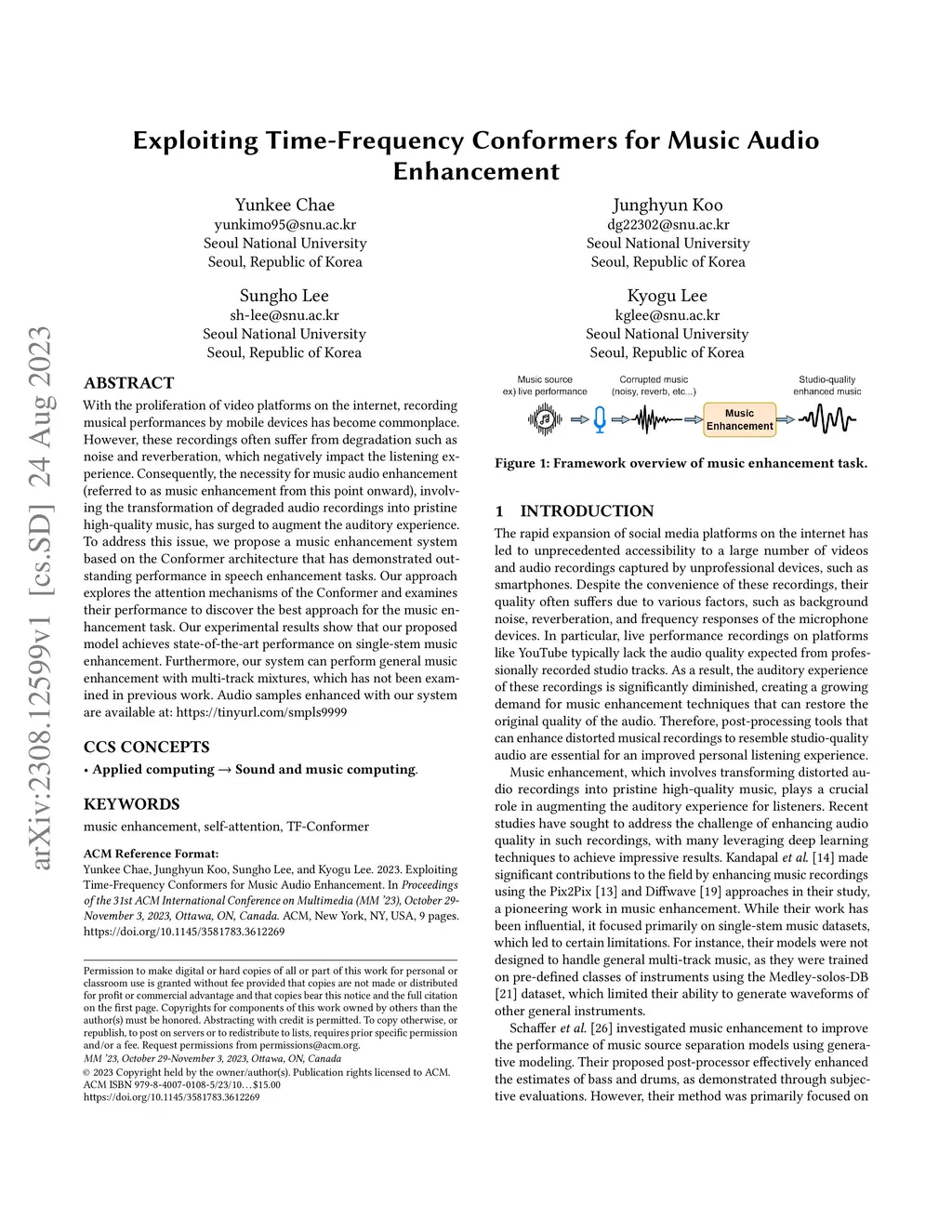 Exploiting Time-Frequency Conformers for Music Audio Enhancement