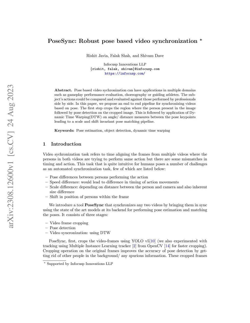 Pose based video sychronization can have applications in multiple domains such as gameplay performance evaluation, choreography or guiding athletes. The subject's actions could be compared and evaluated against those performed by professionals side by side. In this paper, we propose an end to end pipeline for synchronizing videos based on pose. The first step crops the region where the person present in the image followed by pose detection on the cropped image. This is followed by application of Dynamic Time Warping(DTW) on angle/ distance measures between the pose keypoints leading to a scale and shift invariant pose matching pipeline.