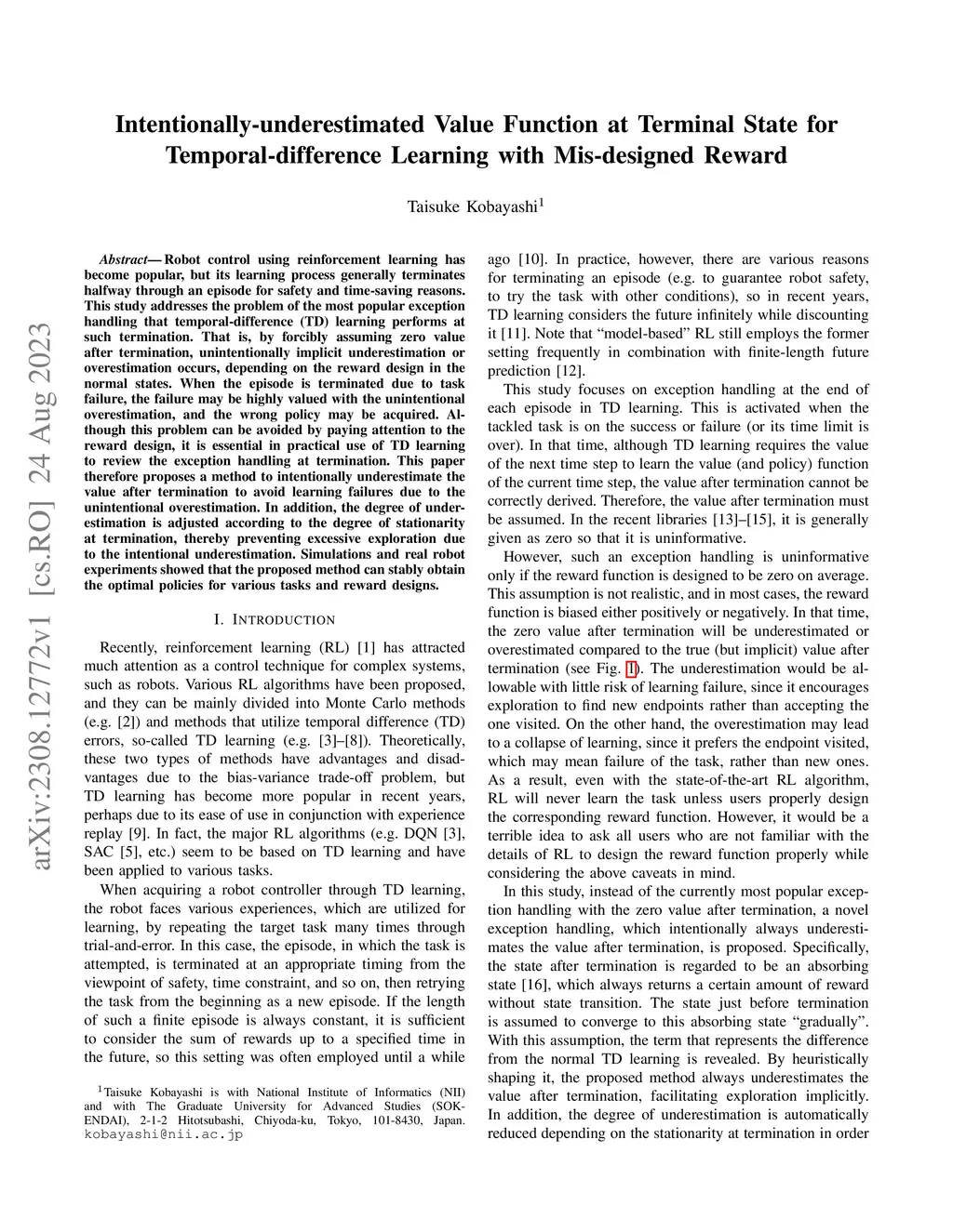 Robot control using reinforcement learning has become popular, but its learning process generally terminates halfway through an episode for safety and time-saving reasons. This study addresses the problem of the most popular exception handling that temporal-difference (TD) learning performs at such termination. That is, by forcibly assuming zero value after termination, unintentionally implicit underestimation or overestimation occurs, depending on the reward design in the normal states. When the episode is terminated due to task failure, the failure may be highly valued with the unintentional overestimation, and the wrong policy may be acquired. Although this problem can be avoided by paying attention to the reward design, it is essential in practical use of TD learning to review the exception handling at termination. This paper therefore proposes a method to intentionally underestimate the value after termination to avoid learning failures due to the unintentional overestimation. In addition, the degree of underestimation is adjusted according to the degree of stationarity at termination, thereby preventing excessive exploration due to the intentional underestimation. Simulations and real robot experiments showed that the proposed method can stably obtain the optimal policies for various tasks and reward designs. https://youtu.be/AxXr8uFOe7M