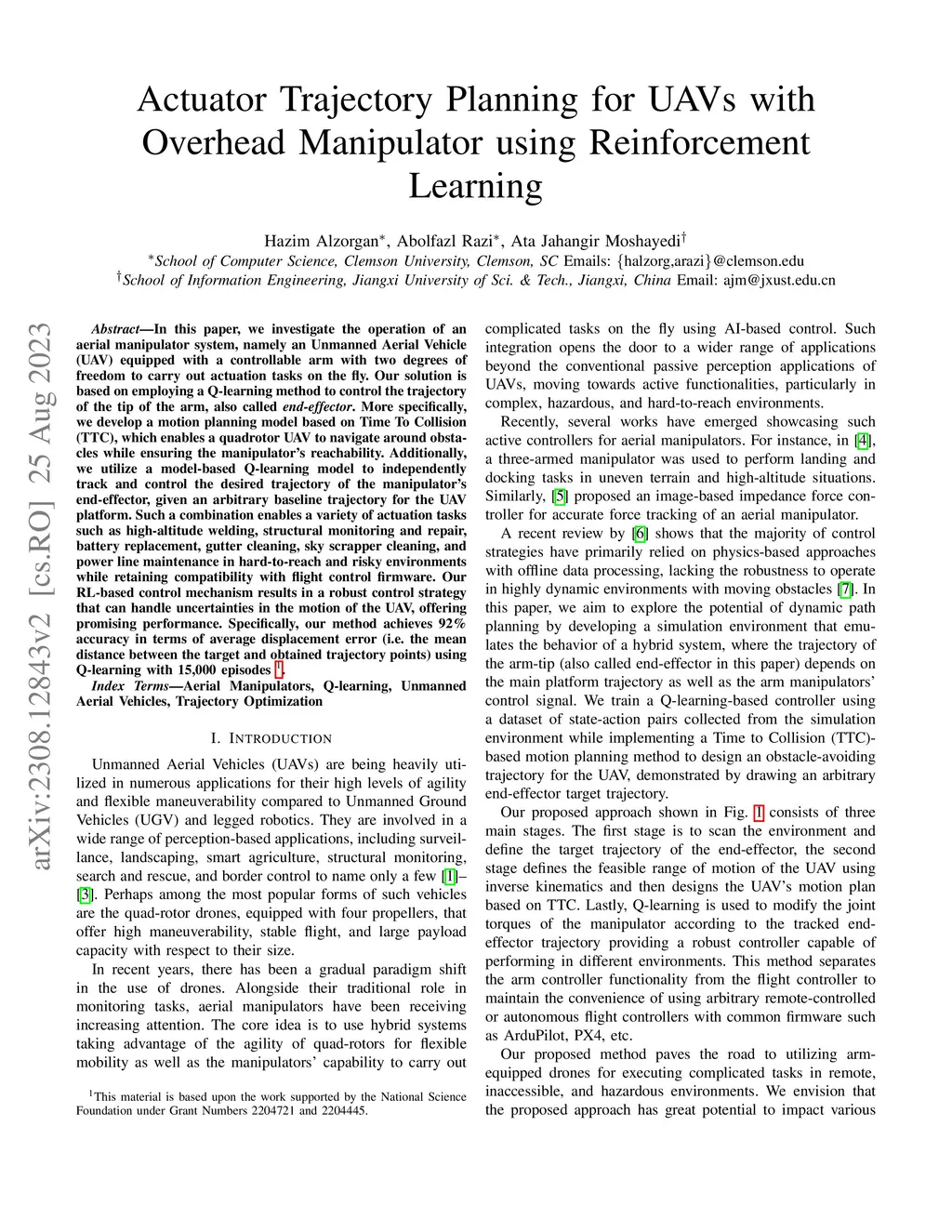 In this paper, we investigate the operation of an aerial manipulator system, namely an Unmanned Aerial Vehicle (UAV) equipped with a controllable arm with two degrees of freedom to carry out actuation tasks on the fly. Our solution is based on employing a Q-learning method to control the trajectory of the tip of the arm, also called end-effector. More specifically, we develop a motion planning model based on Time To Collision (TTC), which enables a quadrotor UAV to navigate around obstacles while ensuring the manipulator's reachability. Additionally, we utilize a model-based Q-learning model to independently track and control the desired trajectory of the manipulator's end-effector, given an arbitrary baseline trajectory for the UAV platform. Such a combination enables a variety of actuation tasks such as high-altitude welding, structural monitoring and repair, battery replacement, gutter cleaning, skyscrapper cleaning, and power line maintenance in hard-to-reach and risky environments while retaining compatibility with flight control firmware. Our RL-based control mechanism results in a robust control strategy that can handle uncertainties in the motion of the UAV, offering promising performance. Specifically, our method achieves 92% accuracy in terms of average displacement error (i.e. the mean distance between the target and obtained trajectory points) using Q-learning with 15,000 episodes