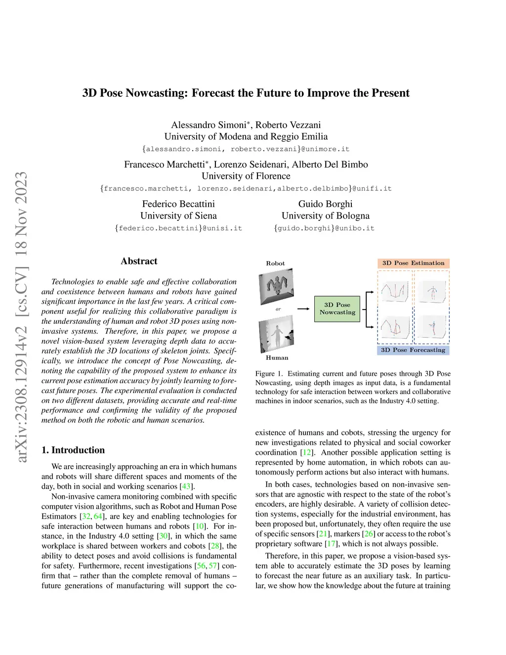 Technologies to enable safe and effective collaboration and coexistence between humans and robots have gained significant importance in the last few years. A critical component useful for realizing this collaborative paradigm is the understanding of human and robot 3D poses using non-invasive systems. Therefore, in this paper, we propose a novel vision-based system leveraging depth data to accurately establish the 3D locations of skeleton joints. Specifically, we introduce the concept of Pose Nowcasting, denoting the capability of the proposed system to enhance its current pose estimation accuracy by jointly learning to forecast future poses. The experimental evaluation is conducted on two different datasets, providing accurate and real-time performance and confirming the validity of the proposed method on both the robotic and human scenarios.