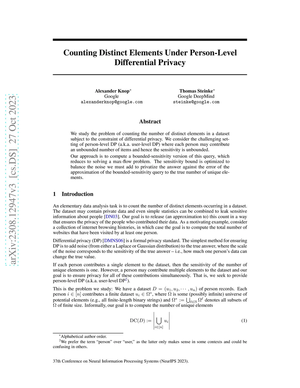 We study the problem of counting the number of distinct elements in a dataset subject to the constraint of differential privacy. We consider the challenging setting of person-level DP (a.k.a. user-level DP) where each person may contribute an unbounded number of items and hence the sensitivity is unbounded. Our approach is to compute a bounded-sensitivity version of this query, which reduces to solving a max-flow problem. The sensitivity bound is optimized to balance the noise we must add to privatize the answer against the error of the approximation of the bounded-sensitivity query to the true number of unique elements.