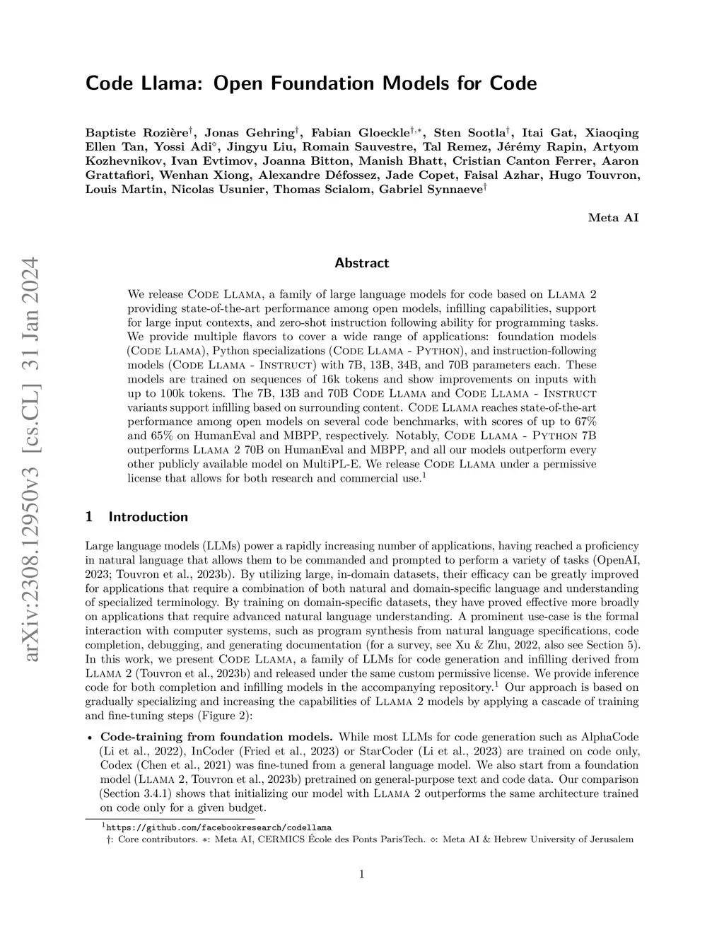 We release Code Llama, a family of large language models for code based on Llama 2 providing state-of-the-art performance among open models, infilling capabilities, support for large input contexts, and zero-shot instruction following ability for programming tasks. We provide multiple flavors to cover a wide range of applications: foundation models (Code Llama), Python specializations (Code Llama - Python), and instruction-following models (Code Llama - Instruct) with 7B, 13B, 34B and 70B parameters each. All models are trained on sequences of 16k tokens and show improvements on inputs with up to 100k tokens. 7B, 13B and 70B Code Llama and Code Llama - Instruct variants support infilling based on surrounding content. Code Llama reaches state-of-the-art performance among open models on several code benchmarks, with scores of up to 67% and 65% on HumanEval and MBPP, respectively. Notably, Code Llama - Python 7B outperforms Llama 2 70B on HumanEval and MBPP, and all our models outperform every other publicly available model on MultiPL-E. We release Code Llama under a permissive license that allows for both research and commercial use.