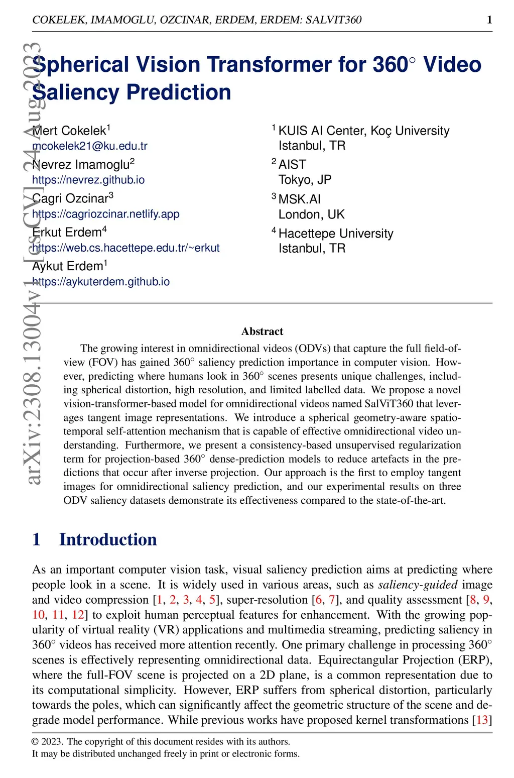 The growing interest in omnidirectional videos (ODVs) that capture the full field-of-view (FOV) has gained 360-degree saliency prediction importance in computer vision. However, predicting where humans look in 360-degree scenes presents unique challenges, including spherical distortion, high resolution, and limited labelled data. We propose a novel vision-transformer-based model for omnidirectional videos named SalViT360 that leverages tangent image representations. We introduce a spherical geometry-aware spatiotemporal self-attention mechanism that is capable of effective omnidirectional video understanding. Furthermore, we present a consistency-based unsupervised regularization term for projection-based 360-degree dense-prediction models to reduce artefacts in the predictions that occur after inverse projection. Our approach is the first to employ tangent images for omnidirectional saliency prediction, and our experimental results on three ODV saliency datasets demonstrate its effectiveness compared to the state-of-the-art.
