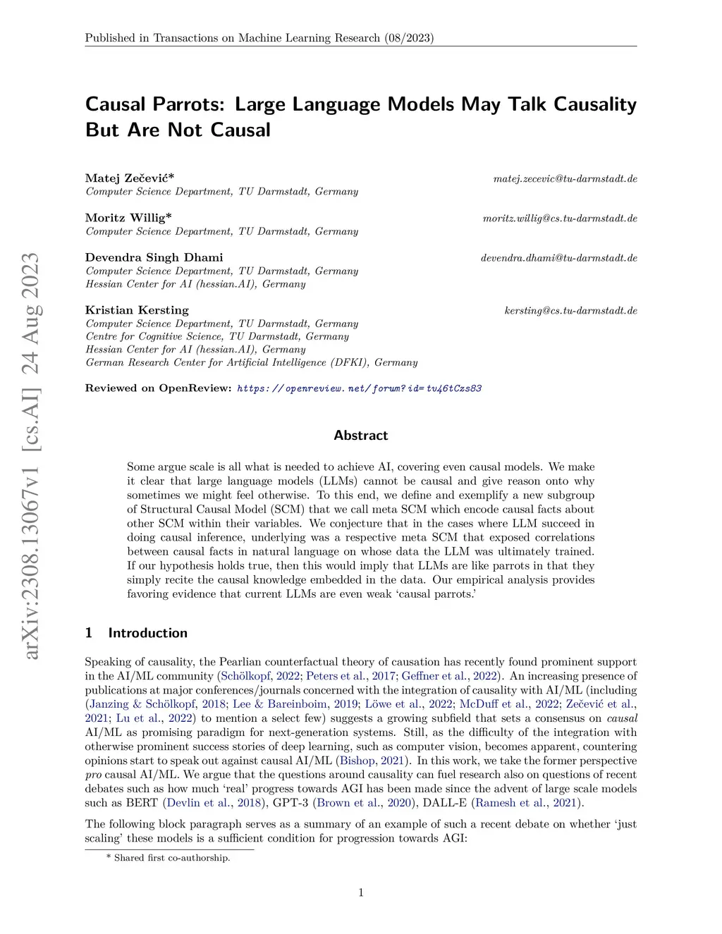 Some argue scale is all what is needed to achieve AI, covering even causal models. We make it clear that large language models (LLMs) cannot be causal and give reason onto why sometimes we might feel otherwise. To this end, we define and exemplify a new subgroup of Structural Causal Model (SCM) that we call meta SCM which encode causal facts about other SCM within their variables. We conjecture that in the cases where LLM succeed in doing causal inference, underlying was a respective meta SCM that exposed correlations between causal facts in natural language on whose data the LLM was ultimately trained. If our hypothesis holds true, then this would imply that LLMs are like parrots in that they simply recite the causal knowledge embedded in the data. Our empirical analysis provides favoring evidence that current LLMs are even weak `causal parrots.'