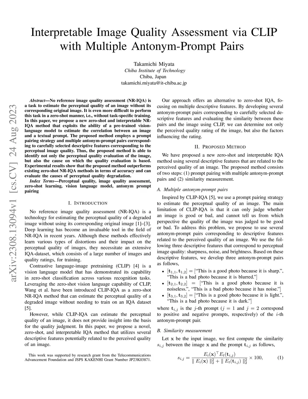 No reference image quality assessment (NR-IQA) is a task to estimate the perceptual quality of an image without its corresponding original image. It is even more difficult to perform this task in a zero-shot manner, i.e., without task-specific training. In this paper, we propose a new zero-shot and interpretable NRIQA method that exploits the ability of a pre-trained visionlanguage model to estimate the correlation between an image and a textual prompt. The proposed method employs a prompt pairing strategy and multiple antonym-prompt pairs corresponding to carefully selected descriptive features corresponding to the perceptual image quality. Thus, the proposed method is able to identify not only the perceptual quality evaluation of the image, but also the cause on which the quality evaluation is based. Experimental results show that the proposed method outperforms existing zero-shot NR-IQA methods in terms of accuracy and can evaluate the causes of perceptual quality degradation.