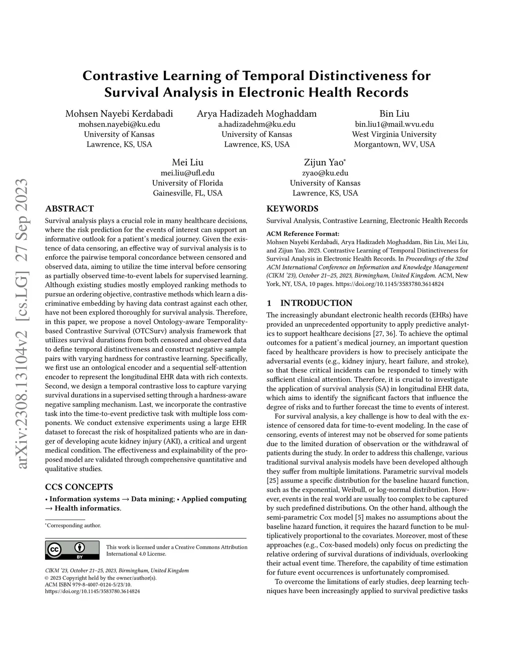 Survival analysis plays a crucial role in many healthcare decisions, where the risk prediction for the events of interest can support an informative outlook for a patient's medical journey. Given the existence of data censoring, an effective way of survival analysis is to enforce the pairwise temporal concordance between censored and observed data, aiming to utilize the time interval before censoring as partially observed time-to-event labels for supervised learning. Although existing studies mostly employed ranking methods to pursue an ordering objective, contrastive methods which learn a discriminative embedding by having data contrast against each other, have not been explored thoroughly for survival analysis. Therefore, in this paper, we propose a novel Ontology-aware Temporality-based Contrastive Survival (OTCSurv) analysis framework that utilizes survival durations from both censored and observed data to define temporal distinctiveness and construct negative sample pairs with adjustable hardness for contrastive learning. Specifically, we first use an ontological encoder and a sequential self-attention encoder to represent the longitudinal EHR data with rich contexts. Second, we design a temporal contrastive loss to capture varying survival durations in a supervised setting through a hardness-aware negative sampling mechanism. Last, we incorporate the contrastive task into the time-to-event predictive task with multiple loss components. We conduct extensive experiments using a large EHR dataset to forecast the risk of hospitalized patients who are in danger of developing acute kidney injury (AKI), a critical and urgent medical condition. The effectiveness and explainability of the proposed model are validated through comprehensive quantitative and qualitative studies.