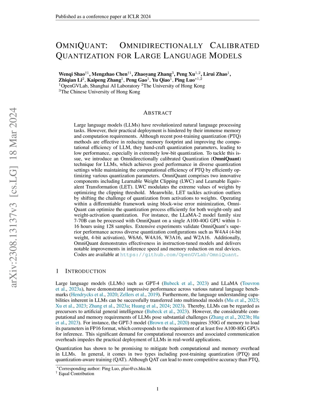 OmniQuant: Omnidirectionally Calibrated Quantization for Large Language