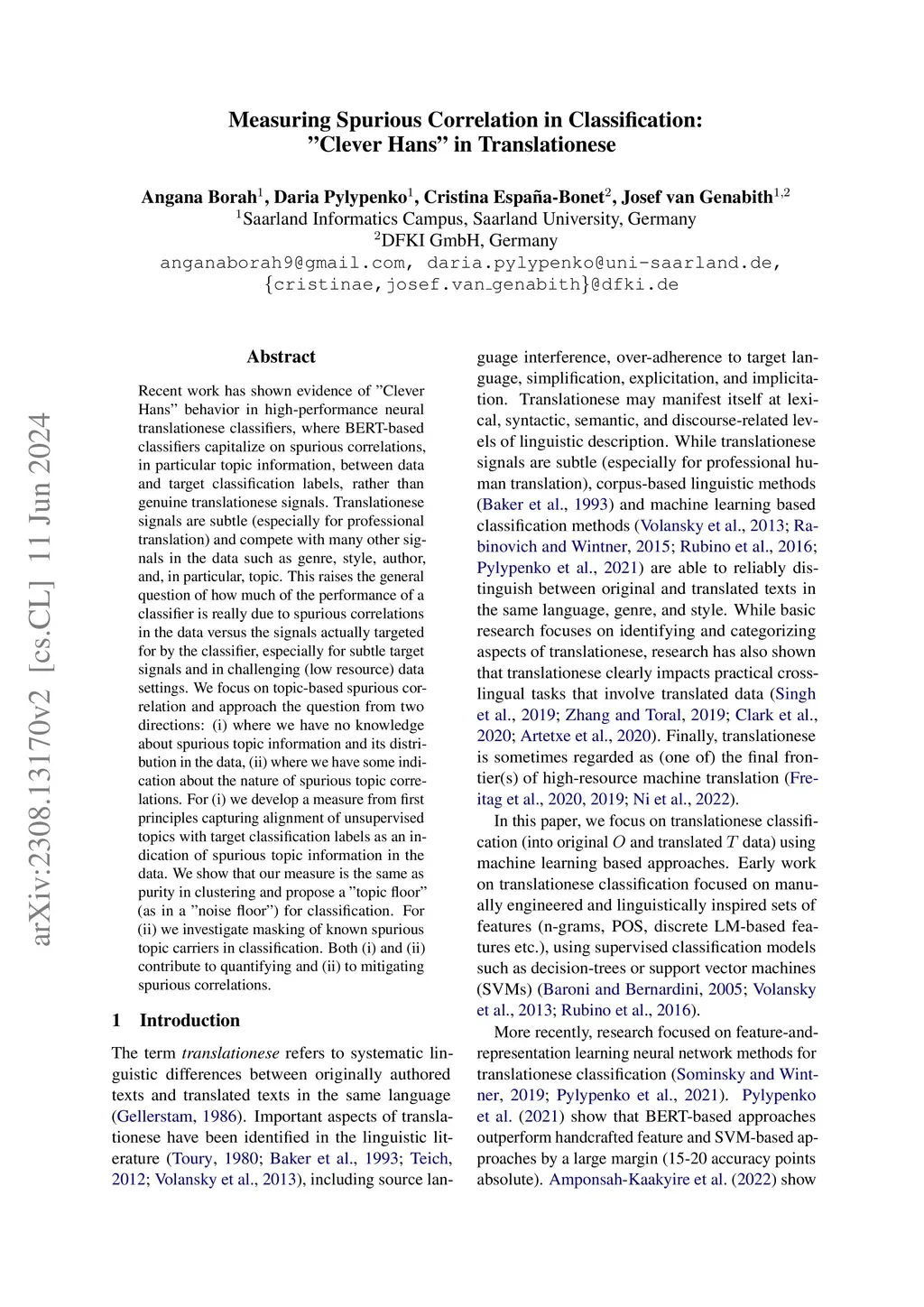Recent work has shown evidence of 'Clever Hans' behavior in high-performance neural translationese classifiers, where BERT-based classifiers capitalize on spurious correlations, in particular topic information, between data and target classification labels, rather than genuine translationese signals. Translationese signals are subtle (especially for professional translation) and compete with many other signals in the data such as genre, style, author, and, in particular, topic. This raises the general question of how much of the performance of a classifier is really due to spurious correlations in the data versus the signals actually targeted for by the classifier, especially for subtle target signals and in challenging (low resource) data settings. We focus on topic-based spurious correlation and approach the question from two directions: (i) where we have no knowledge about spurious topic information and its distribution in the data, (ii) where we have some indication about the nature of spurious topic correlations. For (i) we develop a measure from first principles capturing alignment of unsupervised topics with target classification labels as an indication of spurious topic information in the data. We show that our measure is the same as purity in clustering and propose a 'topic floor' (as in a ñoise floor') for classification. For (ii) we investigate masking of known spurious topic carriers in classification. Both (i) and (ii) contribute to quantifying and (ii) to mitigating spurious correlations.