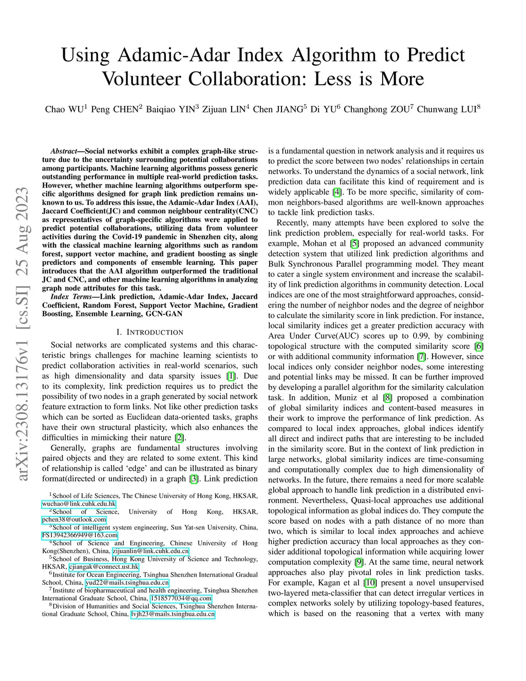 Social networks exhibit a complex graph-like structure due to the uncertainty surrounding potential collaborations among participants. Machine learning algorithms possess generic outstanding performance in multiple real-world prediction tasks. However, whether machine learning algorithms outperform specific algorithms designed for graph link prediction remains unknown to us. To address this issue, the Adamic-Adar Index (AAI), Jaccard Coefficient (JC) and common neighbour centrality (CNC) as representatives of graph-specific algorithms were applied to predict potential collaborations, utilizing data from volunteer activities during the Covid-19 pandemic in Shenzhen city, along with the classical machine learning algorithms such as random forest, support vector machine, and gradient boosting as single predictors and components of ensemble learning. This paper introduces that the AAI algorithm outperformed the traditional JC and CNC, and other machine learning algorithms in analyzing graph node attributes for this task.