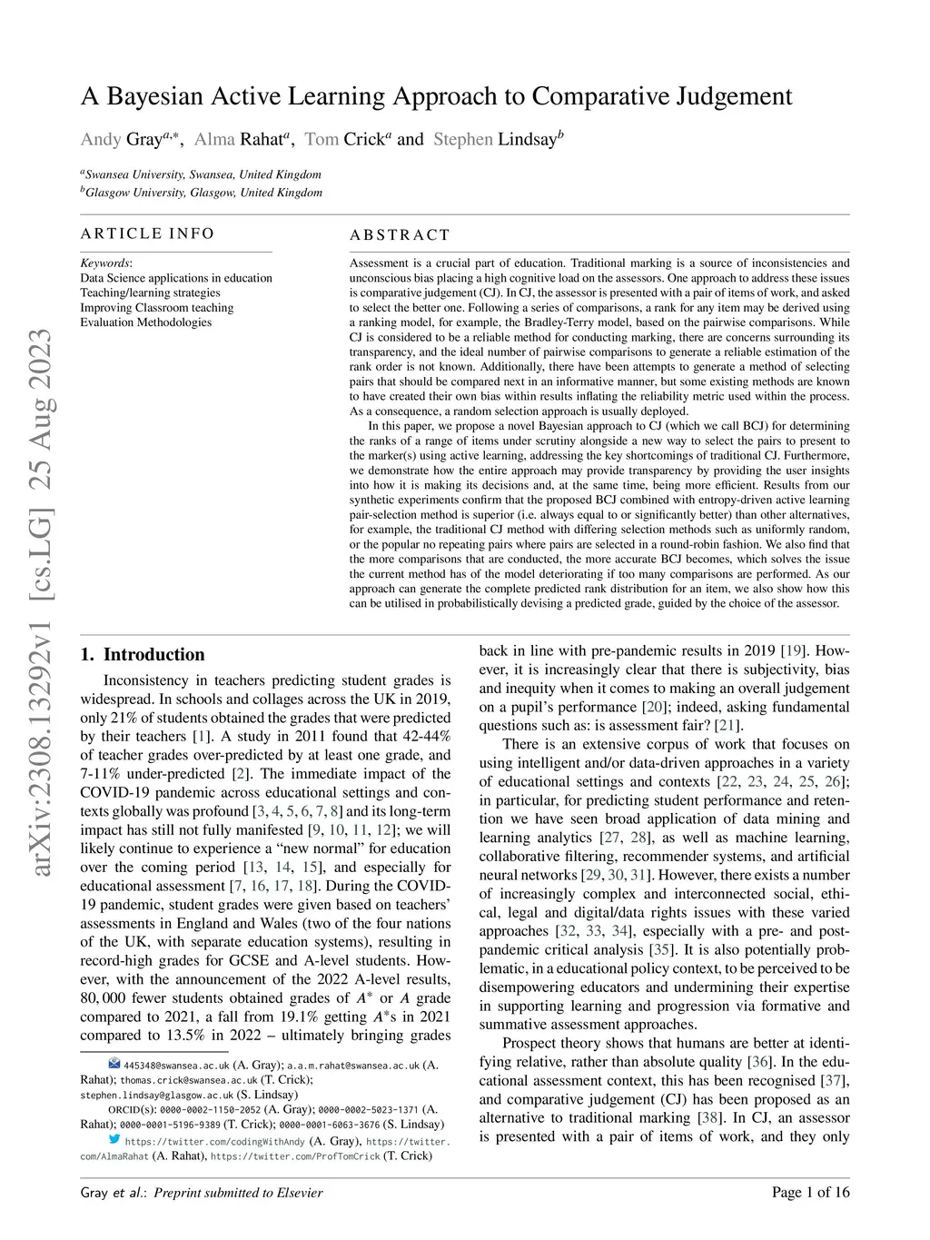 Assessment is a crucial part of education. Traditional marking is a source of inconsistencies and unconscious bias, placing a high cognitive load on the assessors. An approach to address these issues is comparative judgement (CJ). In CJ, the assessor is presented with a pair of items and is asked to select the better one. Following a series of comparisons, a rank is derived using a ranking model, for example, the BTM, based on the results. While CJ is considered a reliable method for marking, there are concerns around transparency, and the ideal number of pairwise comparisons to generate a reliable estimation of the rank order is not known. Additionally, there have been attempts to generate a method of selecting pairs that should be compared next in an informative manner, but some existing methods are known to have created their own bias within results inflating the reliability metric used. As a result, a random selection approach is usually deployed. We propose a novel Bayesian approach to CJ (BCJ) for determining the ranks of compared items alongside a new way to select the pairs to present to the marker(s) using active learning (AL), addressing the key shortcomings of traditional CJ. Furthermore, we demonstrate how the entire approach may provide transparency by providing the user insights into how it is making its decisions and, at the same time, being more efficient. Results from our experiments confirm that the proposed BCJ combined with entropy-driven AL pair-selection method is superior to other alternatives. We also find that the more comparisons done, the more accurate BCJ becomes, which solves the issue the current method has of the model deteriorating if too many comparisons are performed. As our approach can generate the complete predicted rank distribution for an item, we also show how this can be utilised in devising a predicted grade, guided by the assessor.