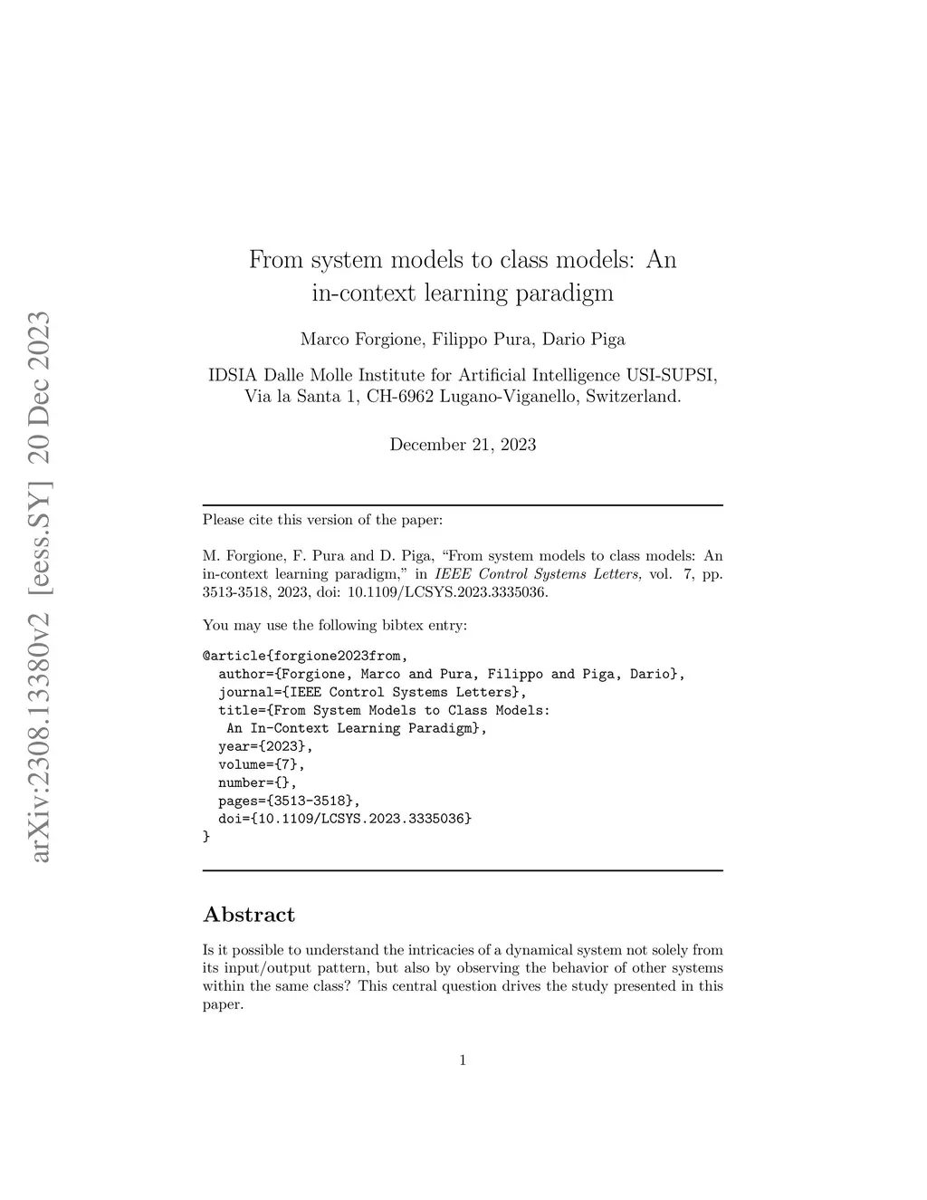 From system models to class models: An in-context learning paradigm