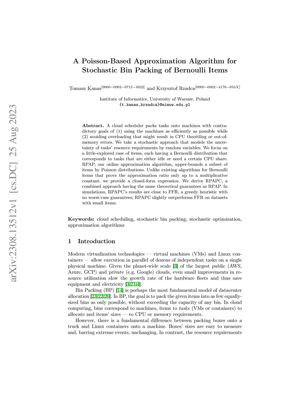 A cloud scheduler packs tasks onto machines with contradictory goals of (1) using the machines as efficiently as possible while (2) avoiding overloading that might result in CPU throttling or out-of-memory errors. We take a stochastic approach that models the uncertainty of tasks' resource requirements by random variables. We focus on a little-explored case of items, each having a Bernoulli distribution that corresponds to tasks that are either idle or need a certain CPU share. RPAP, our online approximation algorithm, upper-bounds a subset of items by Poisson distributions. Unlike existing algorithms for Bernoulli items that prove the approximation ratio only up to a multiplicative constant, we provide a closed-form expression. We derive RPAPC, a combined approach having the same theoretical guarantees as RPAP. In simulations, RPAPC's results are close to FFR, a greedy heuristic with no worst-case guarantees; RPAPC slightly outperforms FFR on datasets with small items.