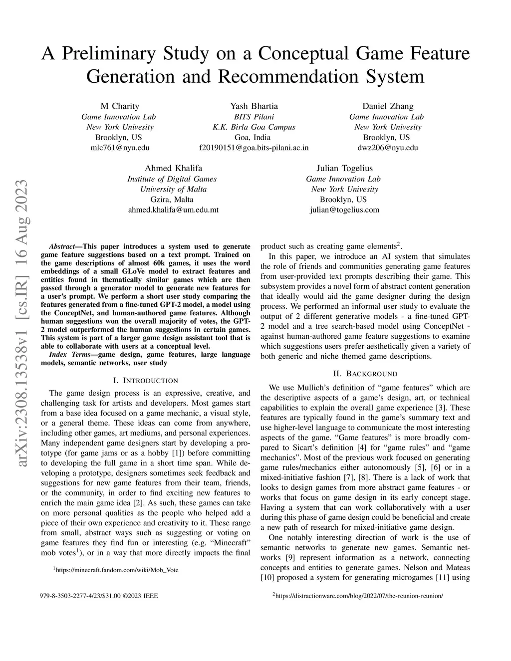 A Preliminary Study on a Conceptual Game Feature Generation and