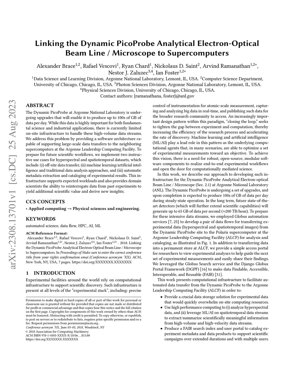 The Dynamic PicoProbe at Argonne National Laboratory is undergoing upgrades that will enable it to produce up to 100s of GB of data per day. While this data is highly important for both fundamental science and industrial applications, there is currently limited on-site infrastructure to handle these high-volume data streams. We address this problem by providing a software architecture capable of supporting large-scale data transfers to the neighboring supercomputers at the Argonne Leadership Computing Facility. To prepare for future scientific workflows, we implement two instructive use cases for hyperspectral and spatiotemporal datasets, which include: (i) off-site data transfer, (ii) machine learning/artificial intelligence and traditional data analysis approaches, and (iii) automatic metadata extraction and cataloging of experimental results. This infrastructure supports expected workloads and also provides domain scientists the ability to reinterrogate data from past experiments to yield additional scientific value and derive new insights.