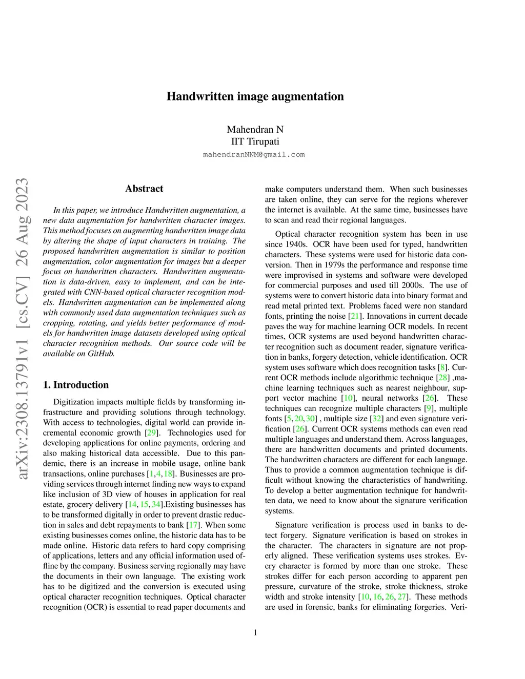 In this paper, we introduce Handwritten augmentation, a new data augmentation for handwritten character images. This method focuses on augmenting handwritten image data by altering the shape of input characters in training. The proposed handwritten augmentation is similar to position augmentation, color augmentation for images but a deeper focus on handwritten characters. Handwritten augmentation is data-driven, easy to implement, and can be integrated with CNN-based optical character recognition models. Handwritten augmentation can be implemented along with commonly used data augmentation techniques such as cropping, rotating, and yields better performance of models for handwritten image datasets developed using optical character recognition methods.