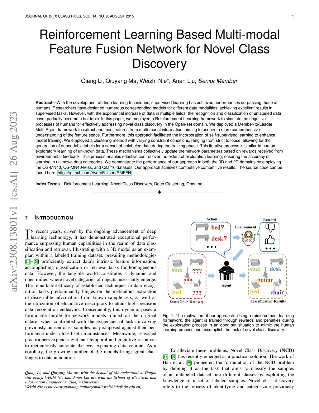 With the development of deep learning techniques, supervised learning has achieved performances surpassing those of humans. Researchers have designed numerous corresponding models for different data modalities, achieving excellent results in supervised tasks. However, with the exponential increase of data in multiple fields, the recognition and classification of unlabeled data have gradually become a hot topic. In this paper, we employed a Reinforcement Learning framework to simulate the cognitive processes of humans for effectively addressing novel class discovery in the Open-set domain. We deployed a Member-to-Leader Multi-Agent framework to extract and fuse features from multi-modal information, aiming to acquire a more comprehensive understanding of the feature space. Furthermore, this approach facilitated the incorporation of self-supervised learning to enhance model training. We employed a clustering method with varying constraint conditions, ranging from strict to loose, allowing for the generation of dependable labels for a subset of unlabeled data during the training phase. This iterative process is similar to human exploratory learning of unknown data. These mechanisms collectively update the network parameters based on rewards received from environmental feedback. This process enables effective control over the extent of exploration learning, ensuring the accuracy of learning in unknown data categories. We demonstrate the performance of our approach in both the 3D and 2D domains by employing the OS-MN40, OS-MN40-Miss, and Cifar10 datasets. Our approach achieves competitive competitive results.