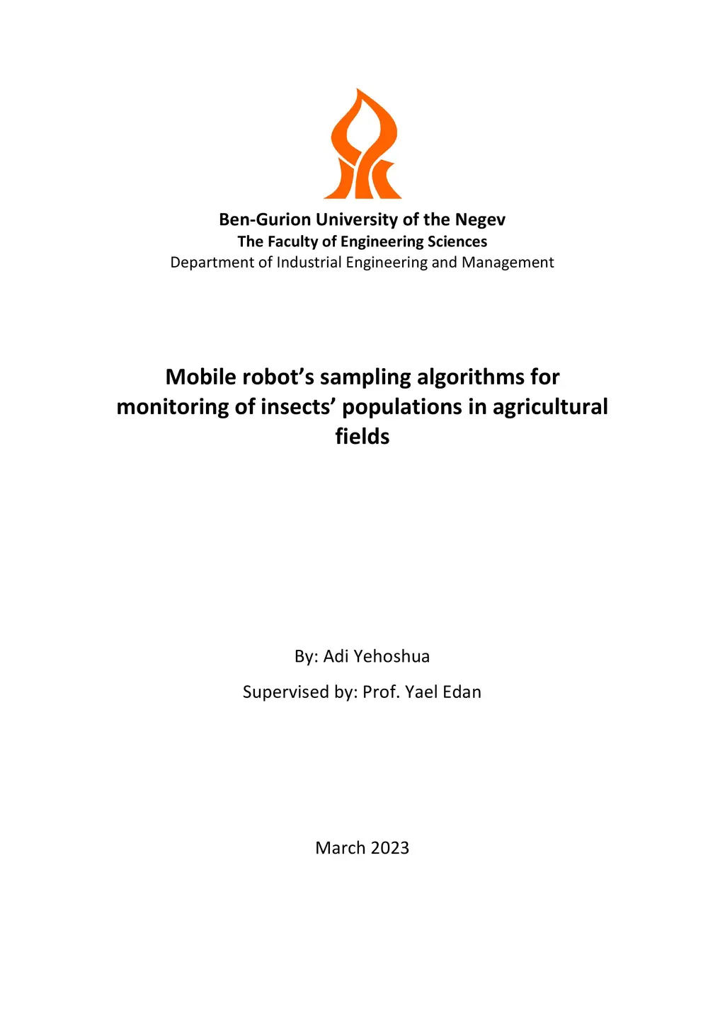 Plant diseases are major causes of production losses and may have a significant impact on the agricultural sector. Detecting pests as early as possible can help increase crop yields and production efficiency. Several robotic monitoring systems have been developed allowing to collect data and provide a greater understanding of environmental processes. An agricultural robot can enable accurate timely detection of pests, by traversing the field autonomously and monitoring the entire cropped area within a field. However, in many cases it is impossible to sample all plants due to resource limitations. In this thesis, the development and evaluation of several sampling algorithms are presented to address the challenge of an agriculture-monitoring ground robot designed to locate insects in an agricultural field, where complete sampling of all the plants is infeasible. Two situations were investigated in simulation models that were specially developed as part of this thesis: where no a-priori information on the insects is available and where prior information on the insects distributions within the field is known. For the first situation, seven algorithms were tested, each utilizing an approach to sample the field without prior knowledge of it. For the second situation, we present the development and evaluation of a dynamic sampling algorithm which utilizes real-time information to prioritize sampling at suspected points, locate hot spots and adapt sampling plans accordingly. The algorithm's performance was compared to two existing algorithms using Tetranychidae insect data from previous research. Analyses revealed that the dynamic algorithm outperformed the others.