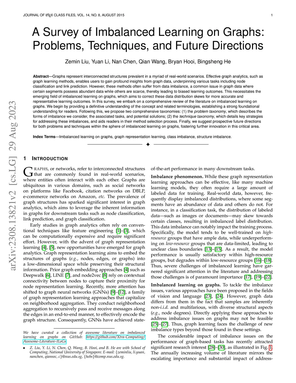 Graphs represent interconnected structures prevalent in a myriad of real-world scenarios. Effective graph analytics, such as graph learning methods, enables users to gain profound insights from graph data, underpinning various tasks including node classification and link prediction. However, these methods often suffer from data imbalance, a common issue in graph data where certain segments possess abundant data while others are scarce, thereby leading to biased learning outcomes. This necessitates the emerging field of imbalanced learning on graphs, which aims to correct these data distribution skews for more accurate and representative learning outcomes. In this survey, we embark on a comprehensive review of the literature on imbalanced learning on graphs. We begin by providing a definitive understanding of the concept and related terminologies, establishing a strong foundational understanding for readers. Following this, we propose two comprehensive taxonomies: (1) the problem taxonomy, which describes the forms of imbalance we consider, the associated tasks, and potential solutions; (2) the technique taxonomy, which details key strategies for addressing these imbalances, and aids readers in their method selection process. Finally, we suggest prospective future directions for both problems and techniques within the sphere of imbalanced learning on graphs, fostering further innovation in this critical area.
