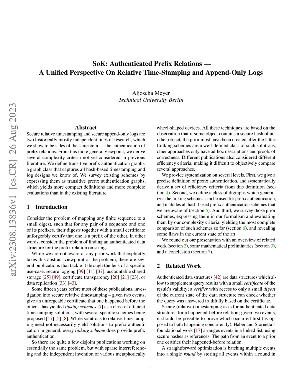 Secure relative timestamping and secure append-only logs are two historically mostly independent lines of research, which we show to be sides of the same coin -- the authentication of prefix relations. From this more general viewpoint, we derive several complexity criteria not yet considered in previous literature. We define transitive prefix authentication graphs, a graph class that captures all hash-based timestamping and log designs we know of. We survey existing schemes by expressing them as transitive prefix authentication graphs, which yields more compact definitions and more complete evaluations than in the existing literature.