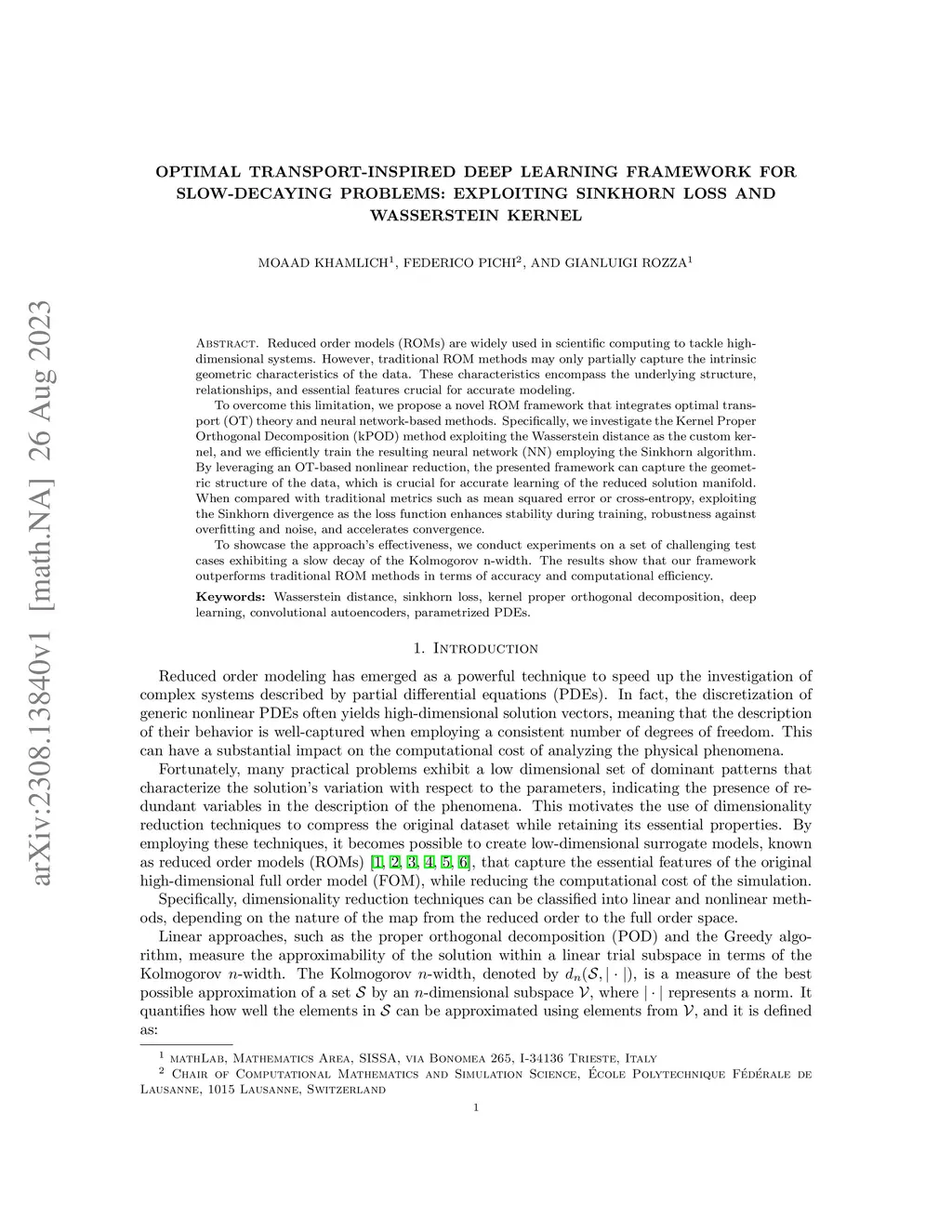 Optimal Transport-inspired Deep Learning Framework for Slow-Decaying Kolmogorov n-width Problems: Exploiting Sinkhorn Loss and Wasserstein Kernel