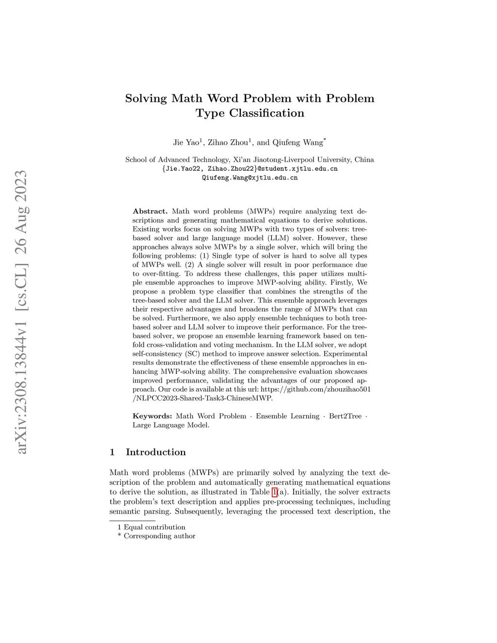 Math word problems (MWPs) require analyzing text descriptions and generating mathematical equations to derive solutions. Existing works focus on solving MWPs with two types of solvers: tree-based solver and large language model (LLM) solver. However, these approaches always solve MWPs by a single solver, which will bring the following problems: (1) Single type of solver is hard to solve all types of MWPs well. (2) A single solver will result in poor performance due to over-fitting. To address these challenges, this paper utilizes multiple ensemble approaches to improve MWP-solving ability. Firstly, We propose a problem type classifier that combines the strengths of the tree-based solver and the LLM solver. This ensemble approach leverages their respective advantages and broadens the range of MWPs that can be solved. Furthermore, we also apply ensemble techniques to both tree-based solver and LLM solver to improve their performance. For the tree-based solver, we propose an ensemble learning framework based on ten-fold cross-validation and voting mechanism. In the LLM solver, we adopt self-consistency (SC) method to improve answer selection. Experimental results demonstrate the effectiveness of these ensemble approaches in enhancing MWP-solving ability. The comprehensive evaluation showcases improved performance, validating the advantages of our proposed approach. Our code is available at this url: https://github.com/zhouzihao501/NLPCC2023-Shared-Task3-ChineseMWP.