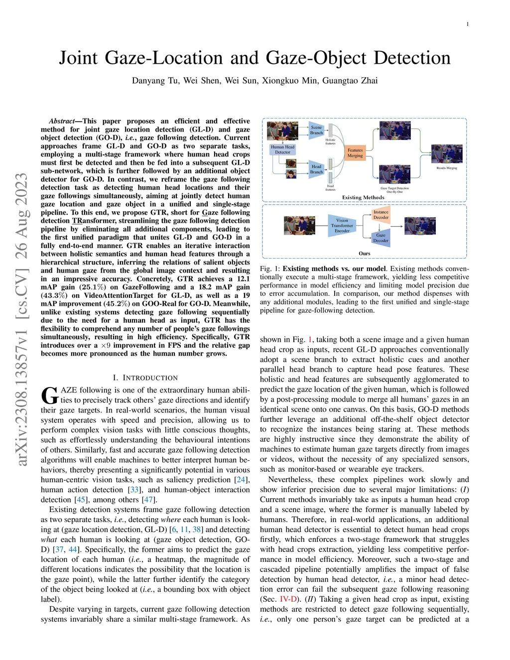 This paper proposes an efficient and effective method for joint gaze location detection (GL-D) and gaze object detection (GO-D), \emph{i.e.}, gaze following detection. Current approaches frame GL-D and GO-D as two separate tasks, employing a multi-stage framework where human head crops must first be detected and then be fed into a subsequent GL-D sub-network, which is further followed by an additional object detector for GO-D. In contrast, we reframe the gaze following detection task as detecting human head locations and their gaze followings simultaneously, aiming at jointly detect human gaze location and gaze object in a unified and single-stage pipeline. To this end, we propose GTR, short for \underline{G}aze following detection \underline{TR}ansformer, streamlining the gaze following detection pipeline by eliminating all additional components, leading to the first unified paradigm that unites GL-D and GO-D in a fully end-to-end manner. GTR enables an iterative interaction between holistic semantics and human head features through a hierarchical structure, inferring the relations of salient objects and human gaze from the global image context and resulting in an impressive accuracy. Concretely, GTR achieves a 12.1 mAP gain () on GazeFollowing and a 18.2 mAP gain () on VideoAttentionTarget for GL-D, as well as a 19 mAP improvement () on GOO-Real for GO-D. Meanwhile, unlike existing systems detecting gaze following sequentially due to the need for a human head as input, GTR has the flexibility to comprehend any number of people's gaze followings simultaneously, resulting in high efficiency. Specifically, GTR introduces over a improvement in FPS and the relative gap becomes more pronounced as the human number grows.