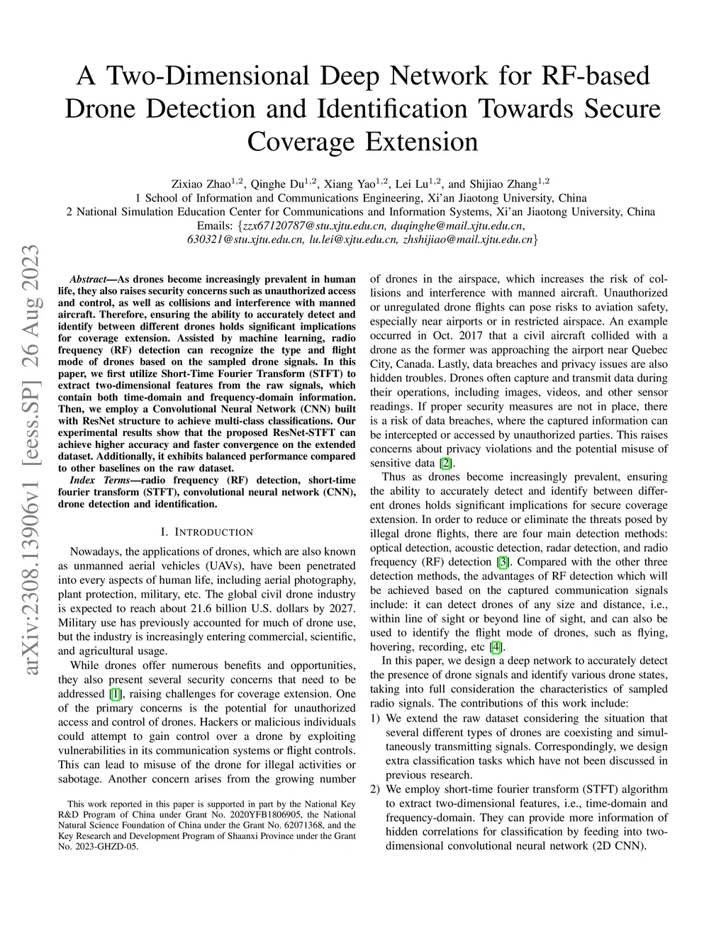 As drones become increasingly prevalent in human life, they also raises security concerns such as unauthorized access and control, as well as collisions and interference with manned aircraft. Therefore, ensuring the ability to accurately detect and identify between different drones holds significant implications for coverage extension. Assisted by machine learning, radio frequency (RF) detection can recognize the type and flight mode of drones based on the sampled drone signals. In this paper, we first utilize Short-Time Fourier. Transform (STFT) to extract two-dimensional features from the raw signals, which contain both time-domain and frequency-domain information. Then, we employ a Convolutional Neural Network (CNN) built with ResNet structure to achieve multi-class classifications. Our experimental results show that the proposed ResNet-STFT can achieve higher accuracy and faster convergence on the extended dataset. Additionally, it exhibits balanced performance compared to other baselines on the raw dataset.
