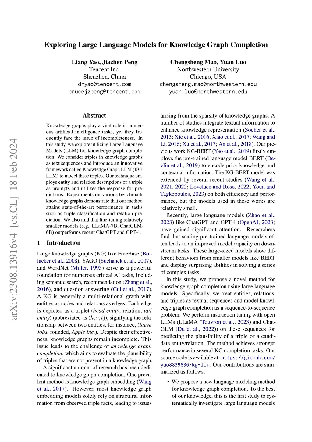 Knowledge graphs play a vital role in numerous artificial intelligence tasks, yet they frequently face the issue of incompleteness. In this study, we explore utilizing Large Language Models (LLM) for knowledge graph completion. We consider triples in knowledge graphs as text sequences and introduce an innovative framework called Knowledge Graph LLM (KG-LLM) to model these triples. Our technique employs entity and relation descriptions of a triple as prompts and utilizes the response for predictions. Experiments on various benchmark knowledge graphs demonstrate that our method attains state-of-the-art performance in tasks such as triple classification and relation prediction. We also find that fine-tuning relatively smaller models (e.g., LLaMA-7B, ChatGLM-6B) outperforms recent ChatGPT and GPT-4.
