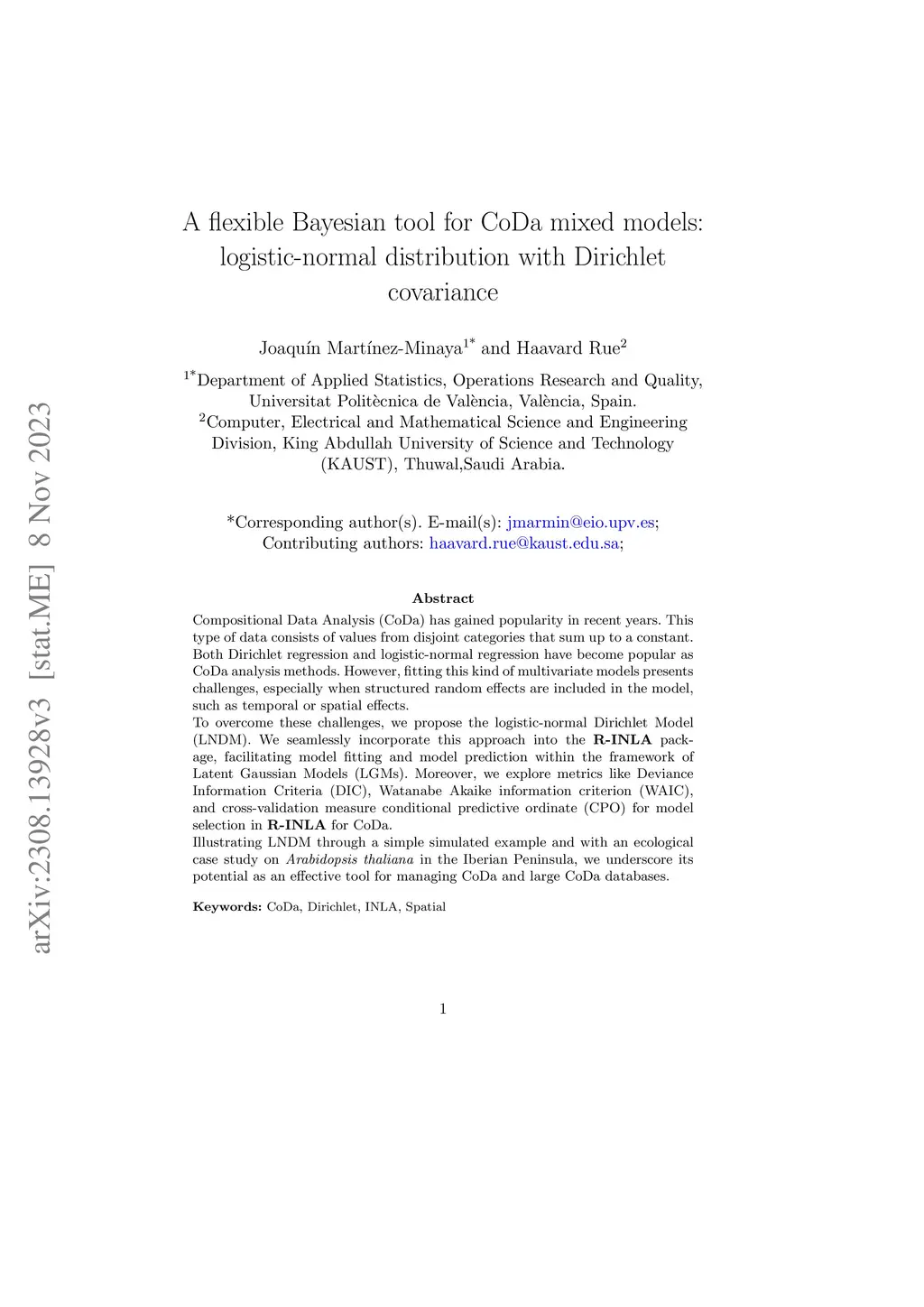 Compositional Data Analysis (CoDa) has gained popularity in recent years. This type of data consists of values from disjoint categories that sum up to a constant. Both Dirichlet regression and logistic-normal regression have become popular as CoDa analysis methods. However, fitting this kind of multivariate models presents challenges, especially when structured random effects are included in the model, such as temporal or spatial effects. To overcome these challenges, we propose the logistic-normal Dirichlet Model (LNDM). We seamlessly incorporate this approach into the \textbf{R-INLA} package, facilitating model fitting, model and model predicting within the framework of Latent Gaussian Models (LGMs). Moreover, we explore metrics like Deviance Information Criteria (DIC), Watanabe Akaike information criterion (WAIC), and cross-validation measure conditional predictive ordinate (CPO) for model selection in \textbf{R-INLA} for CoDa. Illustrating LNDM through a simple simulated example and with an ecological case study on \textit{Arabidopsis thaliana} in the Iberian Peninsula, we underscore its potential as an effective tool for managing CoDa and large CoDa databases.