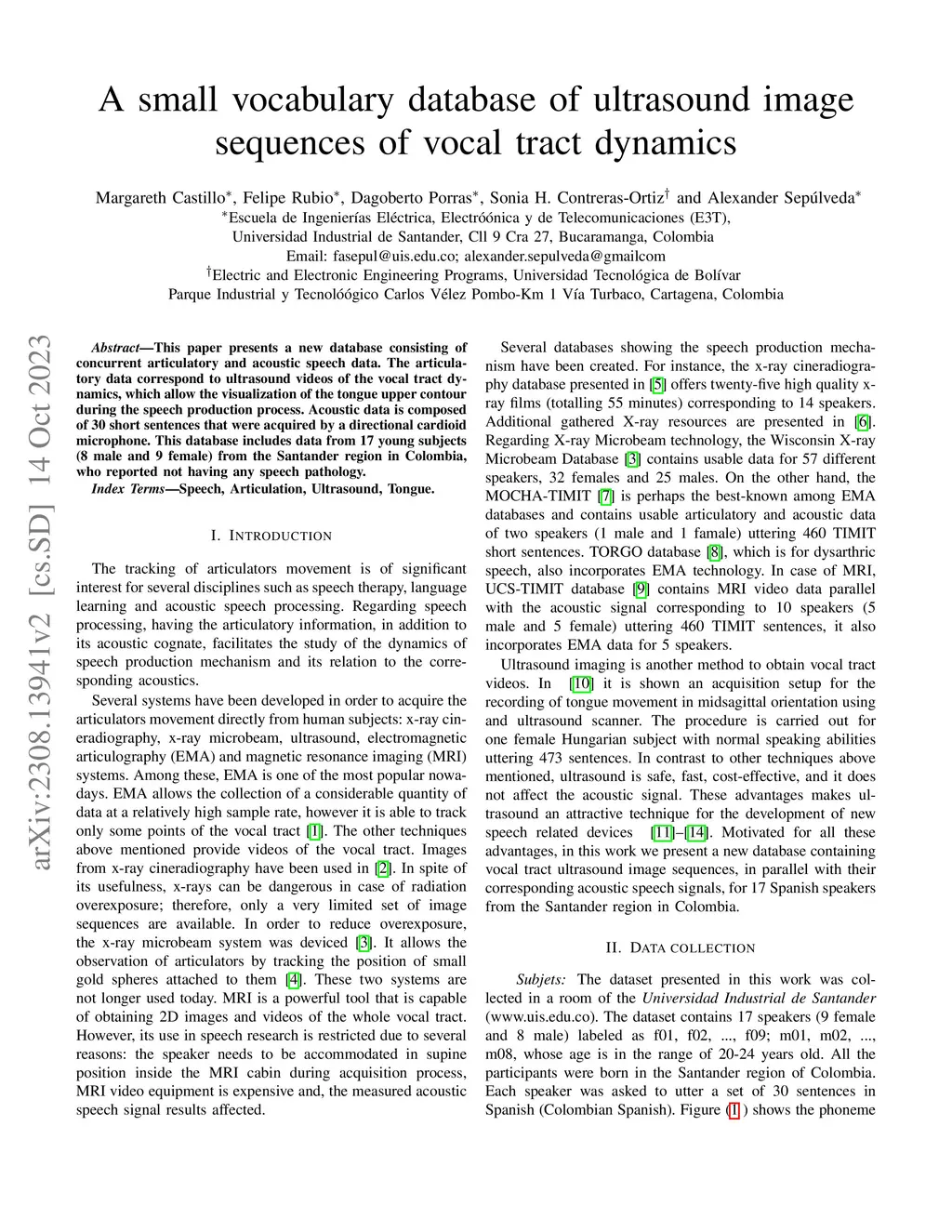 This paper presents a new database consisting of concurrent articulatory and acoustic speech data. The articulatory data correspond to ultrasound videos of the vocal tract dynamics, which allow the visualization of the tongue upper contour during the speech production process. Acoustic data is composed of 30 short sentences that were acquired by a directional cardioid microphone. This database includes data from 17 young subjects (8 male and 9 female) from the Santander region in Colombia, who reported not having any speech pathology.