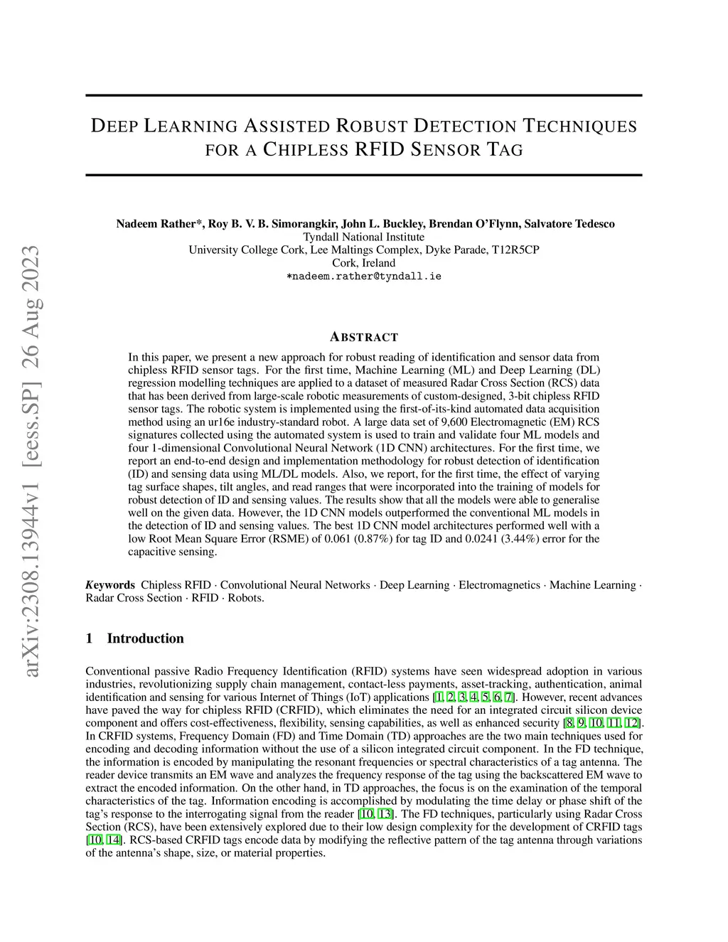 In this paper, we present a new approach for robust reading of identification and sensor data from chipless RFID sensor tags. For the first time, Machine Learning (ML) and Deep Learning (DL) regression modelling techniques are applied to a dataset of measured Radar Cross Section (RCS) data that has been derived from large-scale robotic measurements of custom-designed, 3-bit chipless RFID sensor tags. The robotic system is implemented using the first-of-its-kind automated data acquisition method using an ur16e industry-standard robot. A large data set of 9,600 Electromagnetic (EM) RCS signatures collected using the automated system is used to train and validate four ML models and four 1-dimensional Convolutional Neural Network (1D CNN) architectures. For the first time, we report an end-to-end design and implementation methodology for robust detection of identification (ID) and sensing data using ML/DL models. Also, we report, for the first time, the effect of varying tag surface shapes, tilt angles, and read ranges that were incorporated into the training of models for robust detection of ID and sensing values. The results show that all the models were able to generalise well on the given data. However, the 1D CNN models outperformed the conventional ML models in the detection of ID and sensing values. The best 1D CNN model architectures performed well with a low Root Mean Square Error (RSME) of 0.061 (0.87%) for tag ID and 0.0241 (3.44%) error for the capacitive sensing.