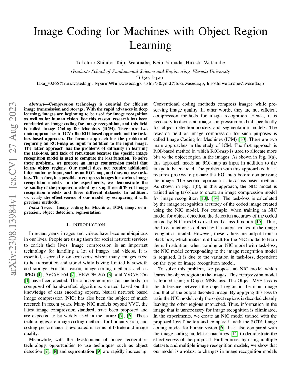Compression technology is essential for efficient image transmission and storage. With the rapid advances in deep learning, images are beginning to be used for image recognition as well as for human vision. For this reason, research has been conducted on image coding for image recognition, and this field is called Image Coding for Machines (ICM). There are two main approaches in ICM: the ROI-based approach and the task-loss-based approach. The former approach has the problem of requiring an ROI-map as input in addition to the input image. The latter approach has the problems of difficulty in learning the task-loss, and lack of robustness because the specific image recognition model is used to compute the loss function. To solve these problems, we propose an image compression model that learns object regions. Our model does not require additional information as input, such as an ROI-map, and does not use task-loss. Therefore, it is possible to compress images for various image recognition models. In the experiments, we demonstrate the versatility of the proposed method by using three different image recognition models and three different datasets. In addition, we verify the effectiveness of our model by comparing it with previous methods.