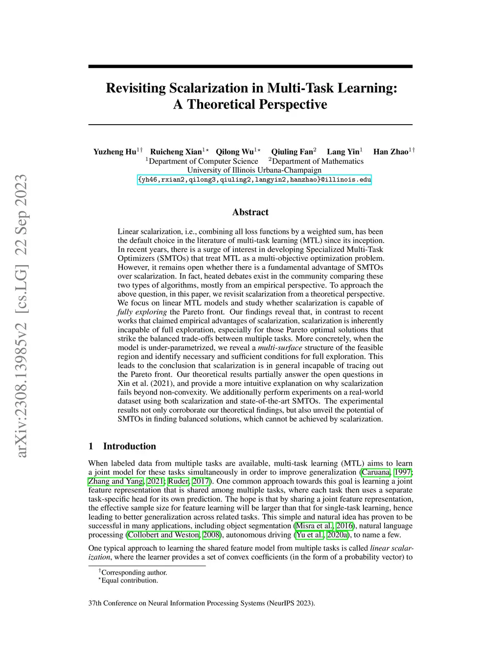 Linear scalarization, i.e., combining all loss functions by a weighted sum, has been the default choice in the literature of multi-task learning (MTL) since its inception. In recent years, there is a surge of interest in developing Specialized Multi-Task Optimizers (SMTOs) that treat MTL as a multi-objective optimization problem. However, it remains open whether there is a fundamental advantage of SMTOs over scalarization. In fact, heated debates exist in the community comparing these two types of algorithms, mostly from an empirical perspective. To approach the above question, in this paper, we revisit scalarization from a theoretical perspective. We focus on linear MTL models and study whether scalarization is capable of fully exploring the Pareto front. Our findings reveal that, in contrast to recent works that claimed empirical advantages of scalarization, scalarization is inherently incapable of full exploration, especially for those Pareto optimal solutions that strike the balanced trade-offs between multiple tasks. More concretely, when the model is under-parametrized, we reveal a multi-surface structure of the feasible region and identify necessary and sufficient conditions for full exploration. This leads to the conclusion that scalarization is in general incapable of tracing out the Pareto front. Our theoretical results partially answer the open questions in Xin et al. (2021), and provide a more intuitive explanation on why scalarization fails beyond non-convexity. We additionally perform experiments on a real-world dataset using both scalarization and state-of-the-art SMTOs. The experimental results not only corroborate our theoretical findings, but also unveil the potential of SMTOs in finding balanced solutions, which cannot be achieved by scalarization.