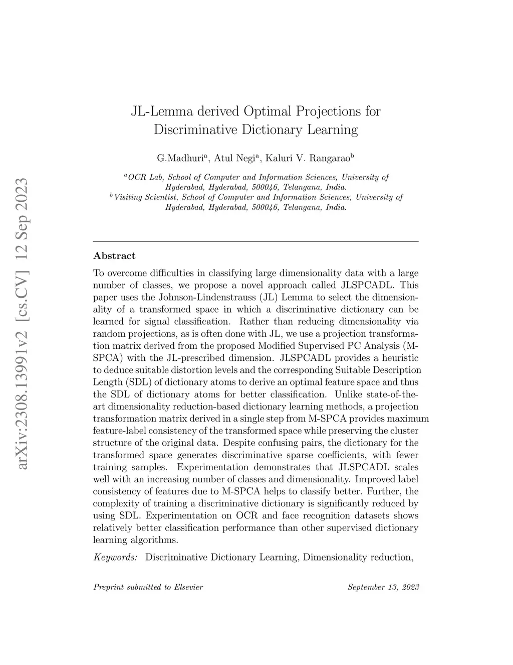 To overcome difficulties in classifying large dimensionality data with a large number of classes, we propose a novel approach called JLSPCADL. This paper uses the Johnson-Lindenstrauss (JL) Lemma to select the dimensionality of a transformed space in which a discriminative dictionary can be learned for signal classification. Rather than reducing dimensionality via random projections, as is often done with JL, we use a projection transformation matrix derived from Modified Supervised PC Analysis (M-SPCA) with the JL-prescribed dimension. JLSPCADL provides a heuristic to deduce suitable distortion levels and the corresponding Suitable Description Length (SDL) of dictionary atoms to derive an optimal feature space and thus the SDL of dictionary atoms for better classification. Unlike state-of-the-art dimensionality reduction-based dictionary learning methods, a projection transformation matrix derived in a single step from M-SPCA provides maximum feature-label consistency of the transformed space while preserving the cluster structure of the original data. Despite confusing pairs, the dictionary for the transformed space generates discriminative sparse coefficients, with fewer training samples. Experimentation demonstrates that JLSPCADL scales well with an increasing number of classes and dimensionality. Improved label consistency of features due to M-SPCA helps to classify better. Further, the complexity of training a discriminative dictionary is significantly reduced by using SDL. Experimentation on OCR and face recognition datasets shows relatively better classification performance than other supervised dictionary learning algorithms.