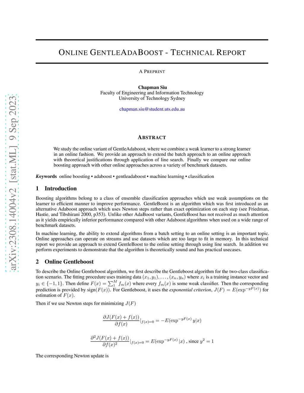We study the online variant of GentleAdaboost, where we combine a weak learner to a strong learner in an online fashion. We provide an approach to extend the batch approach to an online approach with theoretical justifications through application of line search. Finally we compare our online boosting approach with other online approaches across a variety of benchmark datasets.