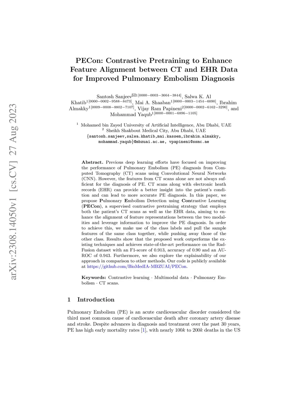 Previous deep learning efforts have focused on improving the performance of Pulmonary Embolism(PE) diagnosis from Computed Tomography (CT) scans using Convolutional Neural Networks (CNN). However, the features from CT scans alone are not always sufficient for the diagnosis of PE. CT scans along with electronic heath records (EHR) can provide a better insight into the patients condition and can lead to more accurate PE diagnosis. In this paper, we propose Pulmonary Embolism Detection using Contrastive Learning (PECon), a supervised contrastive pretraining strategy that employs both the patients CT scans as well as the EHR data, aiming to enhance the alignment of feature representations between the two modalities and leverage information to improve the PE diagnosis. In order to achieve this, we make use of the class labels and pull the sample features of the same class together, while pushing away those of the other class. Results show that the proposed work outperforms the existing techniques and achieves state-of-the-art performance on the RadFusion dataset with an F1-score of 0.913, accuracy of 0.90 and an AUROC of 0.943. Furthermore, we also explore the explainability of our approach in comparison to other methods. Our code is publicly available at https://github.com/BioMedIA-MBZUAI/PECon.