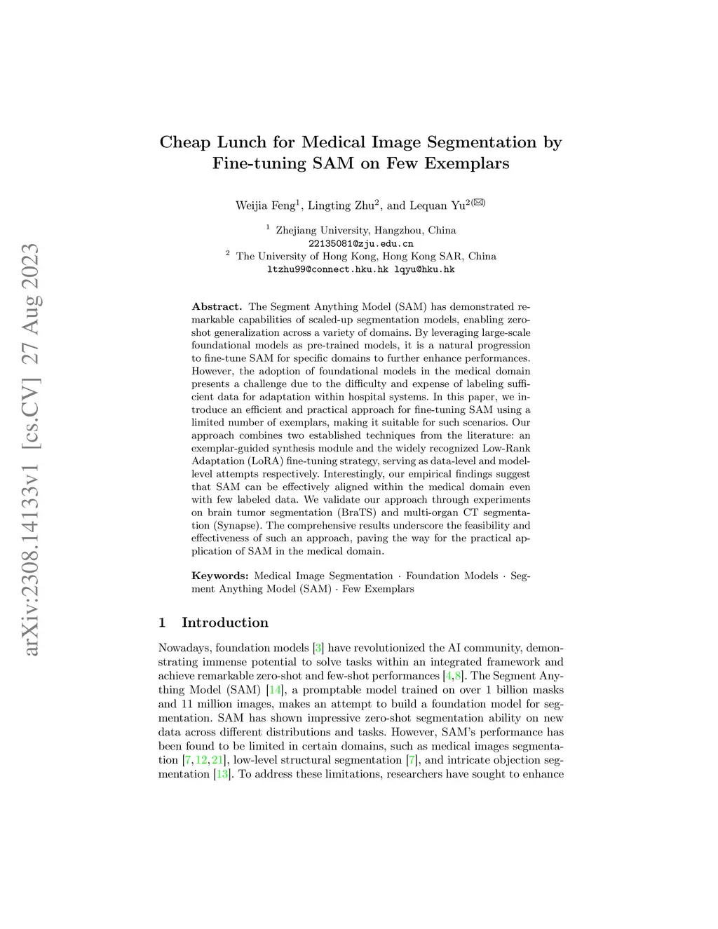 The Segment Anything Model (SAM) has demonstrated remarkable capabilities of scaled-up segmentation models, enabling zero-shot generalization across a variety of domains. By leveraging large-scale foundational models as pre-trained models, it is a natural progression to fine-tune SAM for specific domains to further enhance performances. However, the adoption of foundational models in the medical domain presents a challenge due to the difficulty and expense of labeling sufficient data for adaptation within hospital systems. In this paper, we introduce an efficient and practical approach for fine-tuning SAM using a limited number of exemplars, making it suitable for such scenarios. Our approach combines two established techniques from the literature: an exemplar-guided synthesis module and the widely recognized Low-Rank Adaptation (LoRA) fine-tuning strategy, serving as data-level and model-level attempts respectively. Interestingly, our empirical findings suggest that SAM can be effectively aligned within the medical domain even with few labeled data. We validate our approach through experiments on brain tumor segmentation (BraTS) and multi-organ CT segmentation (Synapse). The comprehensive results underscore the feasibility and effectiveness of such an approach, paving the way for the practical application of SAM in the medical domain.