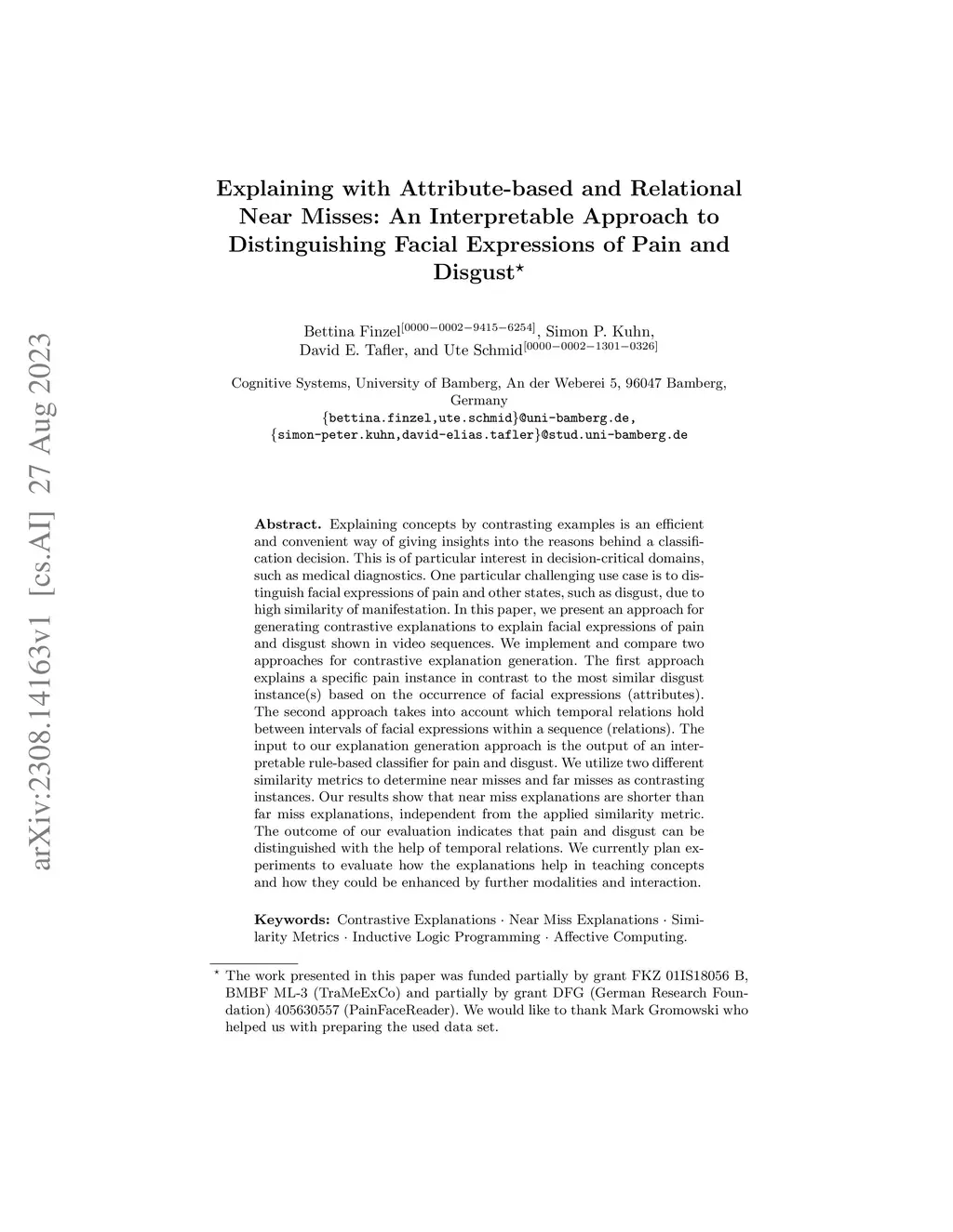 Explaining concepts by contrasting examples is an efficient and convenient way of giving insights into the reasons behind a classification decision. This is of particular interest in decision-critical domains, such as medical diagnostics. One particular challenging use case is to distinguish facial expressions of pain and other states, such as disgust, due to high similarity of manifestation. In this paper, we present an approach for generating contrastive explanations to explain facial expressions of pain and disgust shown in video sequences. We implement and compare two approaches for contrastive explanation generation. The first approach explains a specific pain instance in contrast to the most similar disgust instance(s) based on the occurrence of facial expressions (attributes). The second approach takes into account which temporal relations hold between intervals of facial expressions within a sequence (relations). The input to our explanation generation approach is the output of an interpretable rule-based classifier for pain and disgust.We utilize two different similarity metrics to determine near misses and far misses as contrasting instances. Our results show that near miss explanations are shorter than far miss explanations, independent from the applied similarity metric. The outcome of our evaluation indicates that pain and disgust can be distinguished with the help of temporal relations. We currently plan experiments to evaluate how the explanations help in teaching concepts and how they could be enhanced by further modalities and interaction.