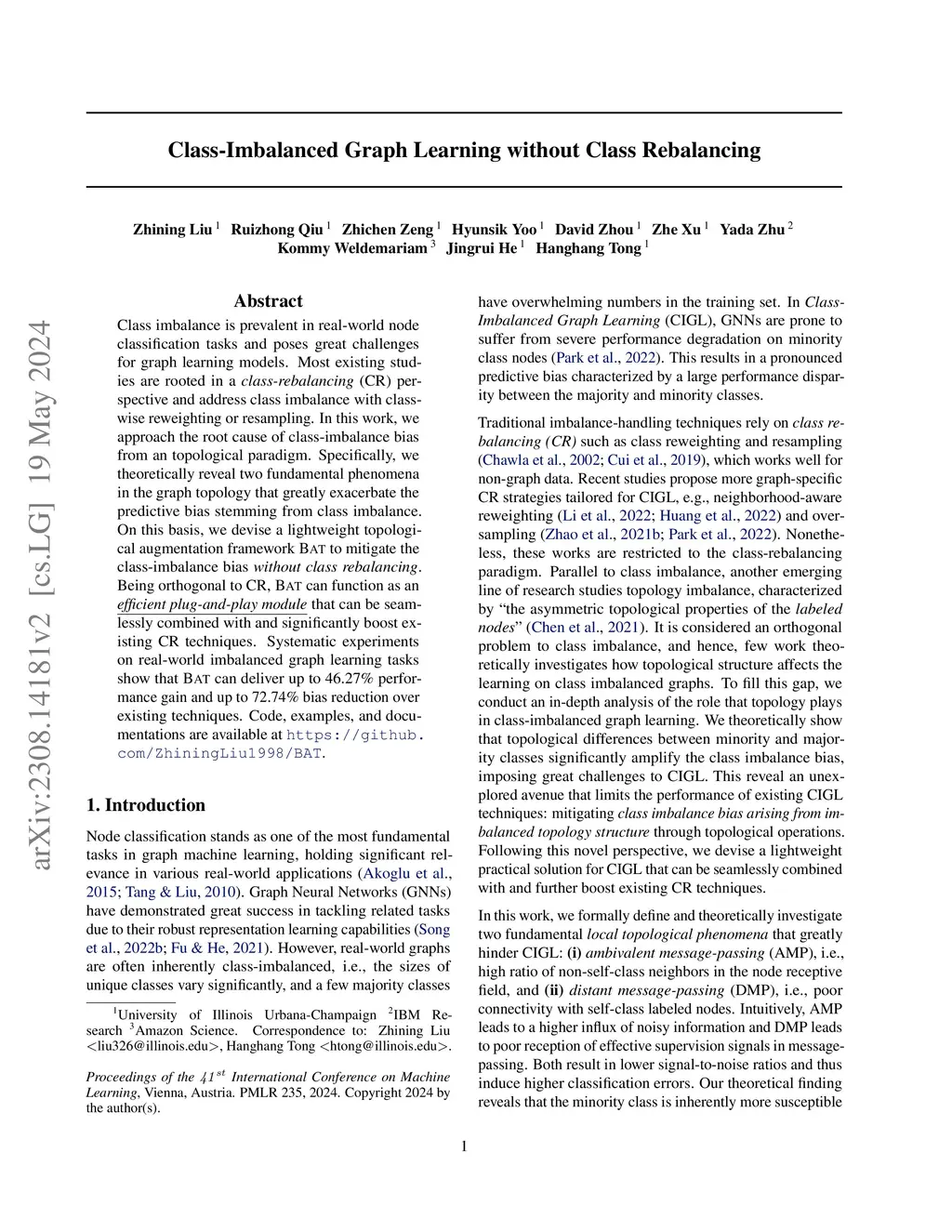 Class imbalance is prevalent in real-world node classification tasks and poses great challenges for graph learning models. Most existing studies are rooted in a class-rebalancing (CR) perspective and address class imbalance with class-wise reweighting or resampling. In this work, we approach the root cause of class-imbalance bias from an topological paradigm. Specifically, we theoretically reveal two fundamental phenomena in the graph topology that greatly exacerbate the predictive bias stemming from class imbalance. On this basis, we devise a lightweight topological augmentation framework BAT to mitigate the class-imbalance bias without class rebalancing. Being orthogonal to CR, BAT can function as an efficient plug-and-play module that can be seamlessly combined with and significantly boost existing CR techniques. Systematic experiments on real-world imbalanced graph learning tasks show that BAT can deliver up to 46.27% performance gain and up to 72.74% bias reduction over existing techniques. Code, examples, and documentations are available at https://github.com/ZhiningLiu1998/BAT.
