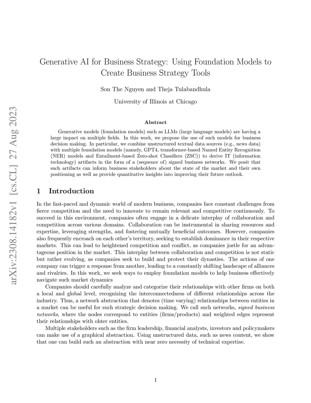 Generative models (foundation models) such as LLMs (large language models) are having a large impact on multiple fields. In this work, we propose the use of such models for business decision making. In particular, we combine unstructured textual data sources (e.g., news data) with multiple foundation models (namely, GPT4, transformer-based Named Entity Recognition (NER) models and Entailment-based Zero-shot Classifiers (ZSC)) to derive IT (information technology) artifacts in the form of a (sequence of) signed business networks. We posit that such artifacts can inform business stakeholders about the state of the market and their own positioning as well as provide quantitative insights into improving their future outlook.