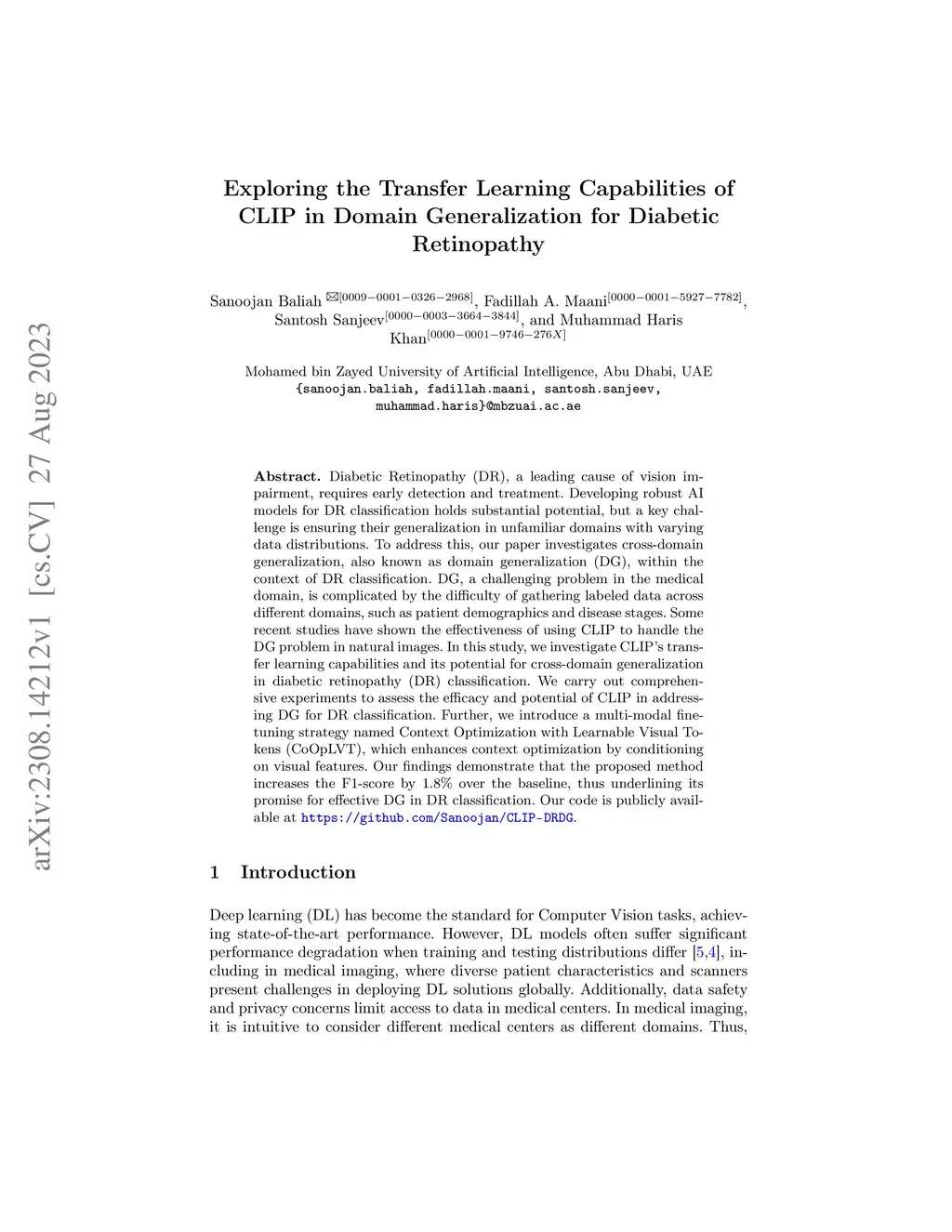 Diabetic Retinopathy (DR), a leading cause of vision impairment, requires early detection and treatment. Developing robust AI models for DR classification holds substantial potential, but a key challenge is ensuring their generalization in unfamiliar domains with varying data distributions. To address this, our paper investigates cross-domain generalization, also known as domain generalization (DG), within the context of DR classification. DG, a challenging problem in the medical domain, is complicated by the difficulty of gathering labeled data across different domains, such as patient demographics and disease stages. Some recent studies have shown the effectiveness of using CLIP to handle the DG problem in natural images. In this study, we investigate CLIP's transfer learning capabilities and its potential for cross-domain generalization in diabetic retinopathy (DR) classification. We carry out comprehensive experiments to assess the efficacy and potential of CLIP in addressing DG for DR classification. Further, we introduce a multi-modal fine-tuning strategy named Context Optimization with Learnable Visual Tokens (CoOpLVT), which enhances context optimization by conditioning on visual features. Our findings demonstrate that the proposed method increases the F1-score by 1.8% over the baseline, thus underlining its promise for effective DG in DR classification. Our code is publicly available at https://github.com/Sanoojan/CLIP-DRDG.
