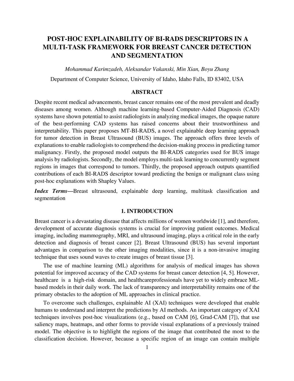 Despite recent medical advancements, breast cancer remains one of the most prevalent and deadly diseases among women. Although machine learning-based Computer-Aided Diagnosis (CAD) systems have shown potential to assist radiologists in analyzing medical images, the opaque nature of the best-performing CAD systems has raised concerns about their trustworthiness and interpretability. This paper proposes MT-BI-RADS, a novel explainable deep learning approach for tumor detection in Breast Ultrasound (BUS) images. The approach offers three levels of explanations to enable radiologists to comprehend the decision-making process in predicting tumor malignancy. Firstly, the proposed model outputs the BI-RADS categories used for BUS image analysis by radiologists. Secondly, the model employs multi-task learning to concurrently segment regions in images that correspond to tumors. Thirdly, the proposed approach outputs quantified contributions of each BI-RADS descriptor toward predicting the benign or malignant class using post-hoc explanations with Shapley Values.