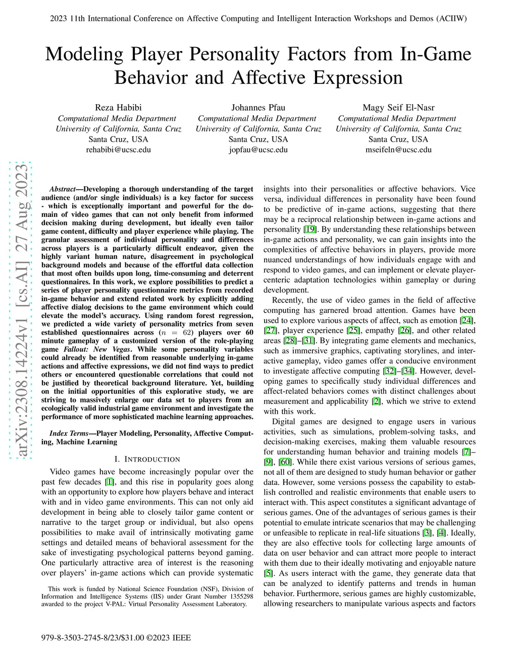 Modeling Player Personality Factors from In-Game Behavior and Affective