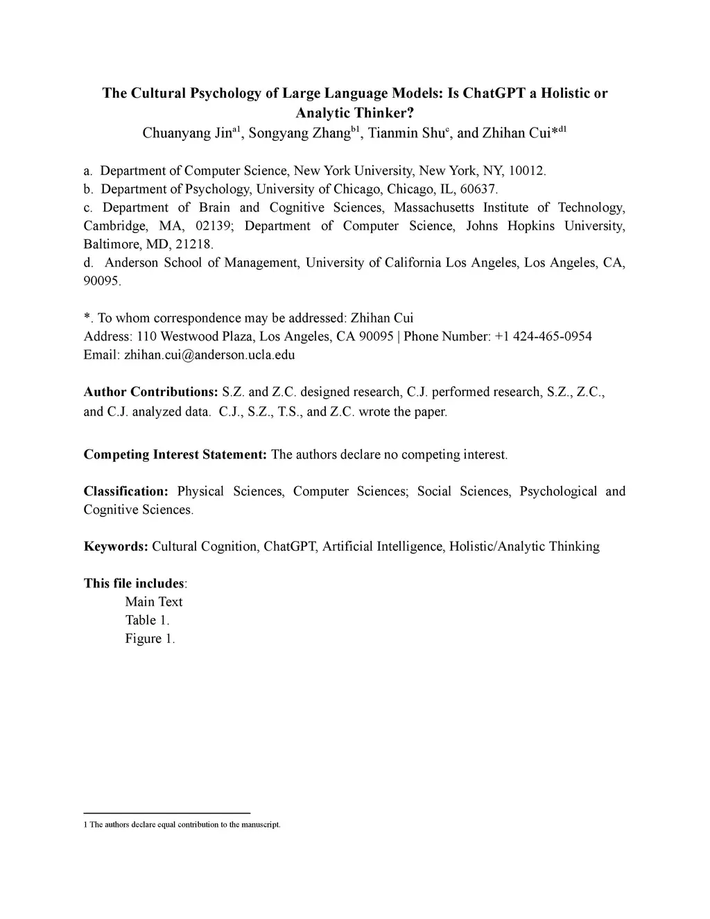 The prevalent use of Large Language Models (LLMs) has necessitated studying their mental models, yielding noteworthy theoretical and practical implications. Current research has demonstrated that state-of-the-art LLMs, such as ChatGPT, exhibit certain theory of mind capabilities and possess relatively stable Big Five and/or MBTI personality traits. In addition, cognitive process features form an essential component of these mental models. Research in cultural psychology indicated significant differences in the cognitive processes of Eastern and Western people when processing information and making judgments. While Westerners predominantly exhibit analytical thinking that isolates things from their environment to analyze their nature independently, Easterners often showcase holistic thinking, emphasizing relationships and adopting a global viewpoint. In our research, we probed the cultural cognitive traits of ChatGPT. We employed two scales that directly measure the cognitive process: the Analysis-Holism Scale (AHS) and the Triadic Categorization Task (TCT). Additionally, we used two scales that investigate the value differences shaped by cultural thinking: the Dialectical Self Scale (DSS) and the Self-construal Scale (SCS). In cognitive process tests (AHS/TCT), ChatGPT consistently tends towards Eastern holistic thinking, but regarding value judgments (DSS/SCS), ChatGPT does not significantly lean towards the East or the West. We suggest that the result could be attributed to both the training paradigm and the training data in LLM development. We discuss the potential value of this finding for AI research and directions for future research.