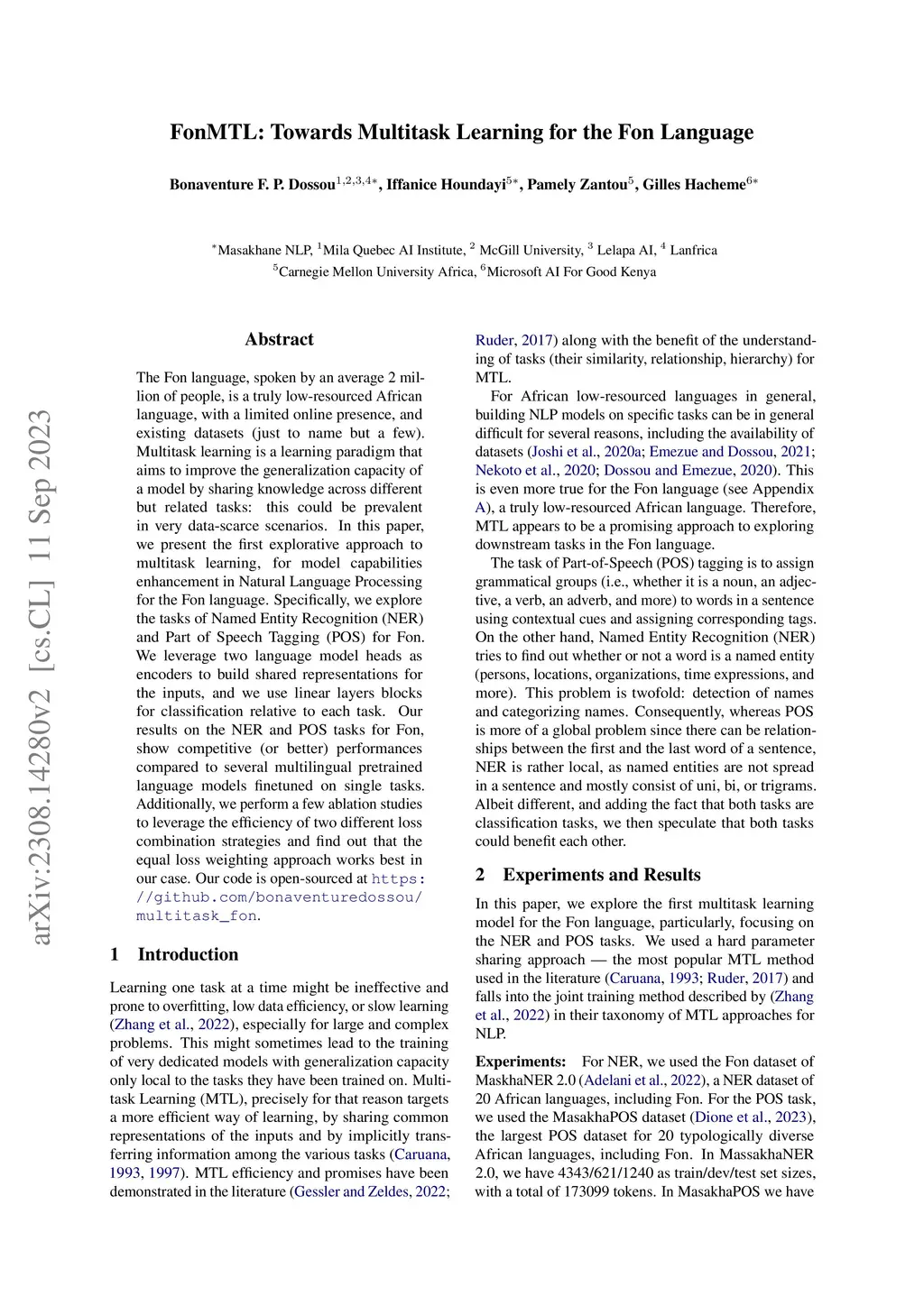 The Fon language, spoken by an average 2 million of people, is a truly low-resourced African language, with a limited online presence, and existing datasets (just to name but a few). Multitask learning is a learning paradigm that aims to improve the generalization capacity of a model by sharing knowledge across different but related tasks: this could be prevalent in very data-scarce scenarios. In this paper, we present the first explorative approach to multitask learning, for model capabilities enhancement in Natural Language Processing for the Fon language. Specifically, we explore the tasks of Named Entity Recognition (NER) and Part of Speech Tagging (POS) for Fon. We leverage two language model heads as encoders to build shared representations for the inputs, and we use linear layers blocks for classification relative to each task. Our results on the NER and POS tasks for Fon, show competitive (or better) performances compared to several multilingual pretrained language models finetuned on single tasks. Additionally, we perform a few ablation studies to leverage the efficiency of two different loss combination strategies and find out that the equal loss weighting approach works best in our case. Our code is open-sourced at https://github.com/bonaventuredossou/multitask_fon.